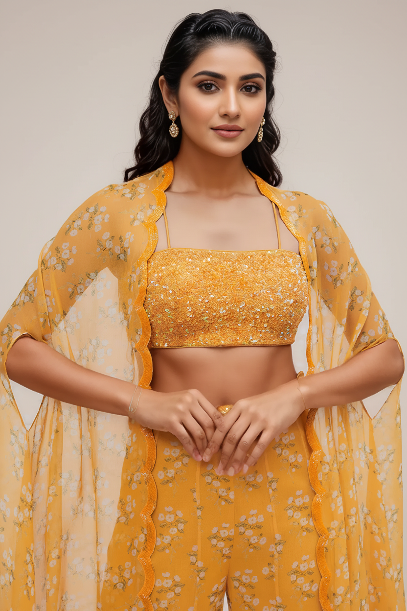 Kesar Raw Silk & Chiffon Printed Cape Set