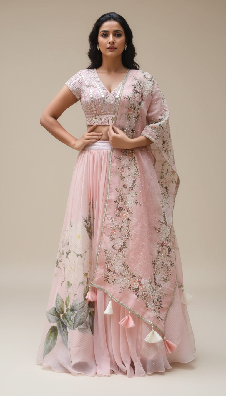 PERSIAN DORI BLOUSE WITH NET SHARARA AND SASH WITH DRAPED DUPATTA AND HIGHLIGHTED DIGITAL PRINTED CAPE
