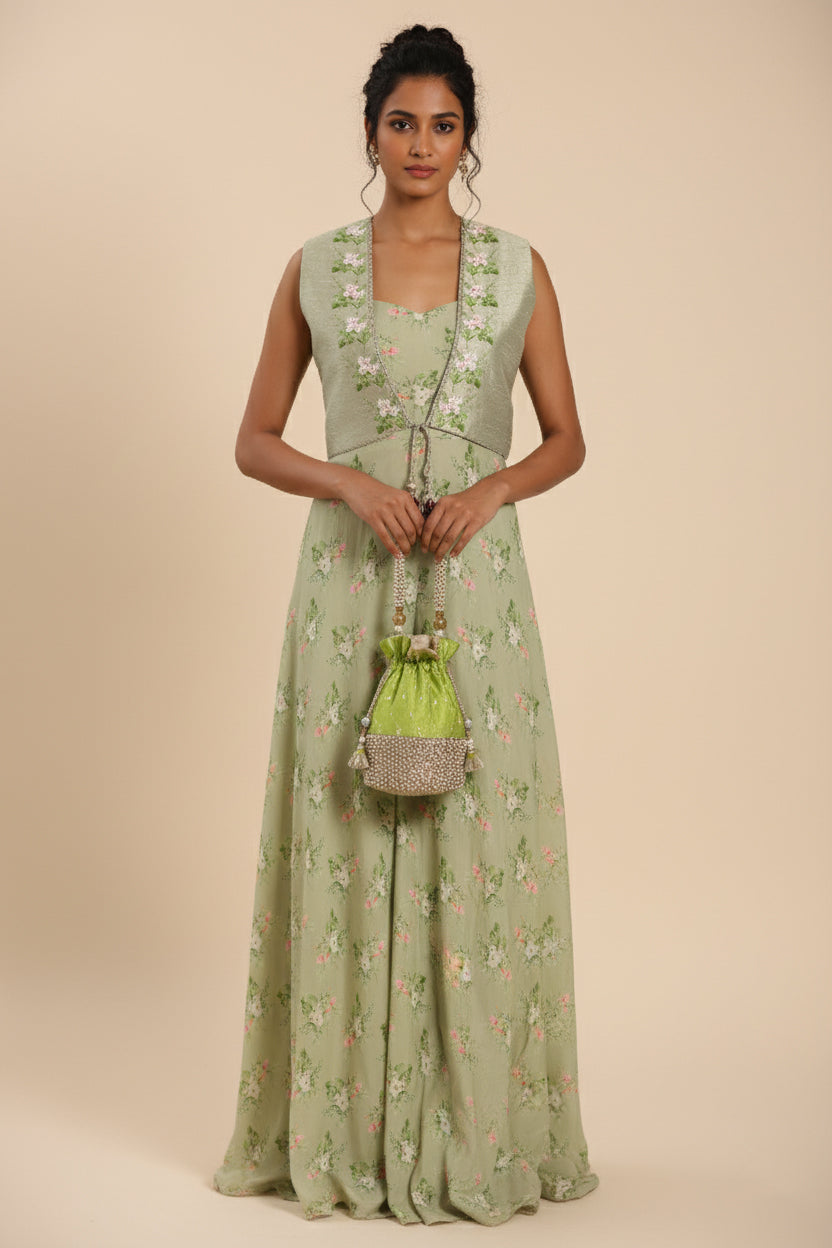 Fresh, floral, and effortlessly elegant — the Meadow Bloom Printed Jacket Set brings a breath of springtime charm to your festive wardrobe. Crafted in a soothing pistachio green hue, this ensemble features a flowy floral-printed dress paired with an intricately embroidered cropped jacket. The soft floral motifs and delicate thread detailing exude femininity, while the relaxed silhouette ensures all-day comfort. Styled with a handcrafted potli bag, this look is perfect for daytime celebrations, garden parties, or intimate festive gatherings.