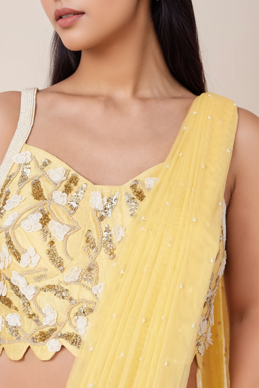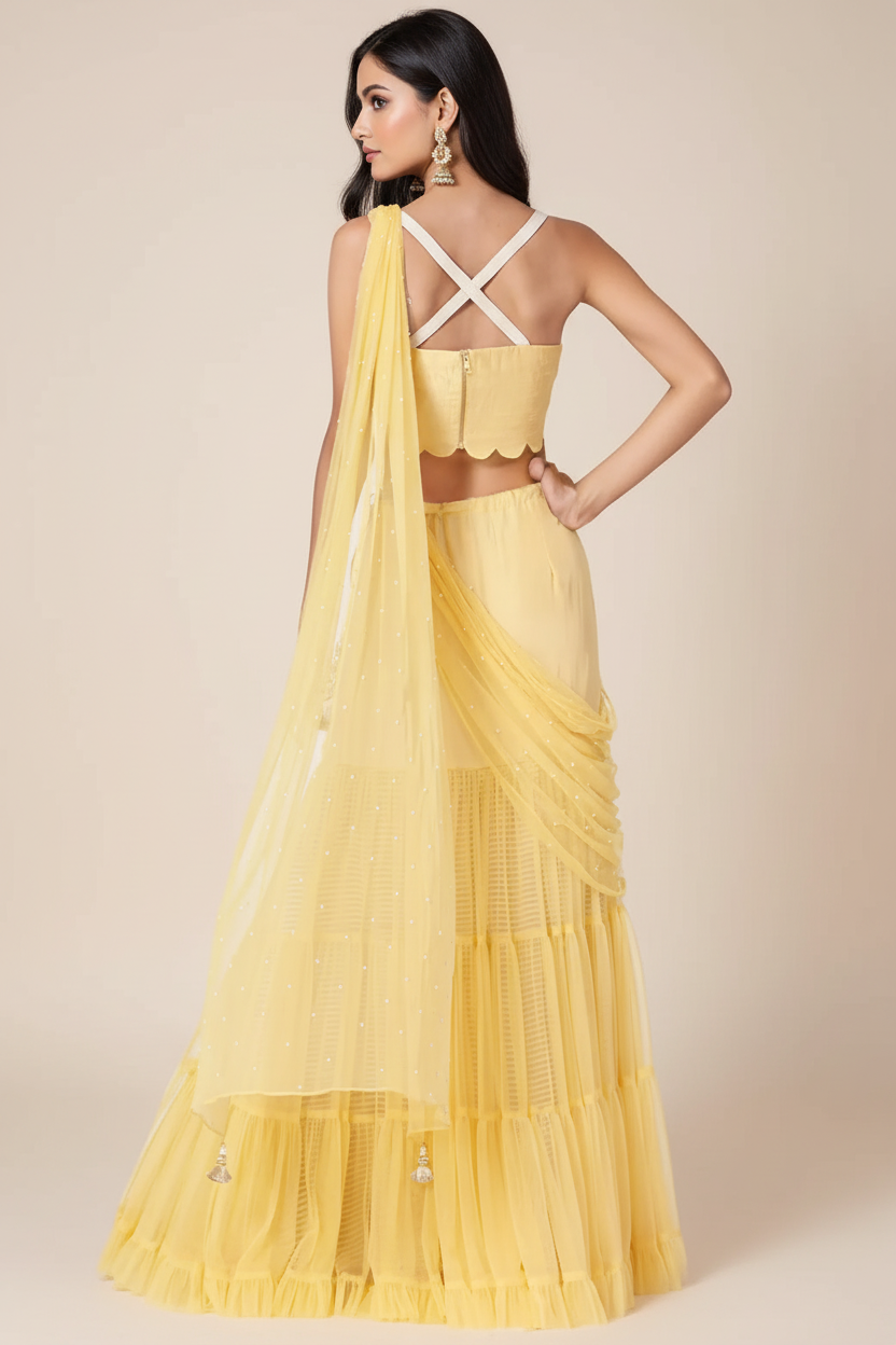 A yellow chiffon lehenga set is a vibrant and eye-catching outfit, perfect for a summer wedding, mehndi ceremony, or any festive occasion. The lightweight and flowy chiffon fabric creates a beautiful drape, while the yellow color adds a touch of sunshine and cheer.