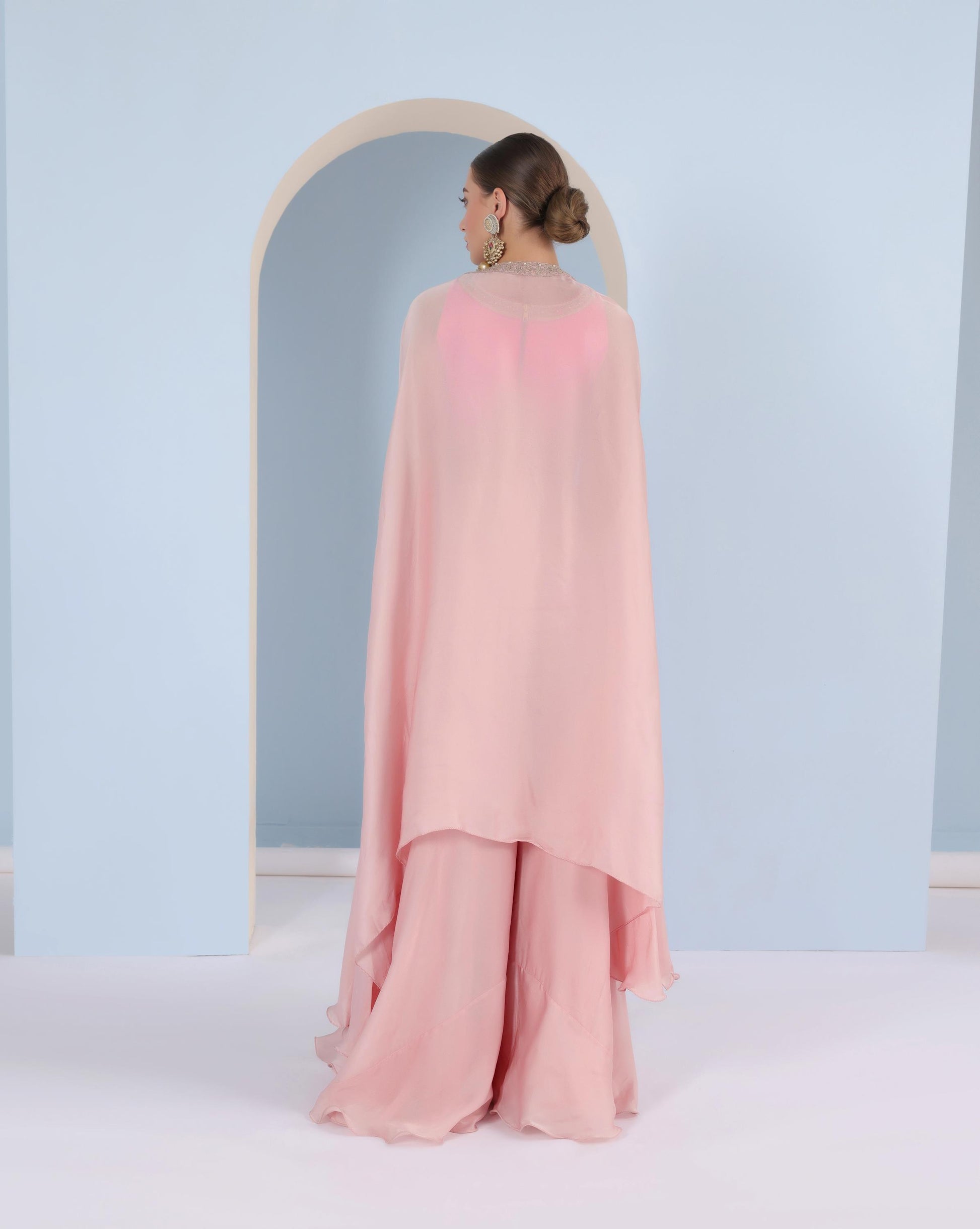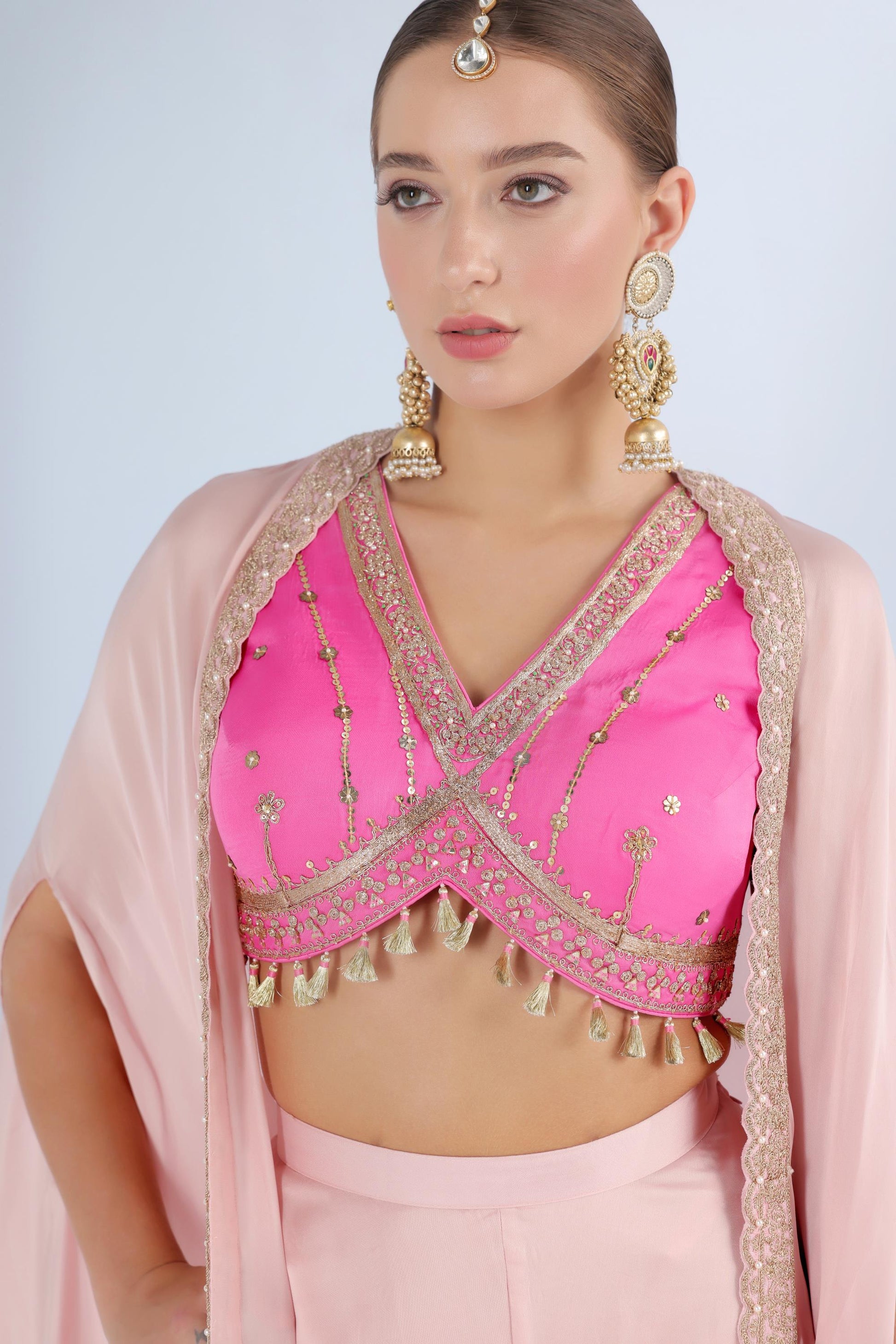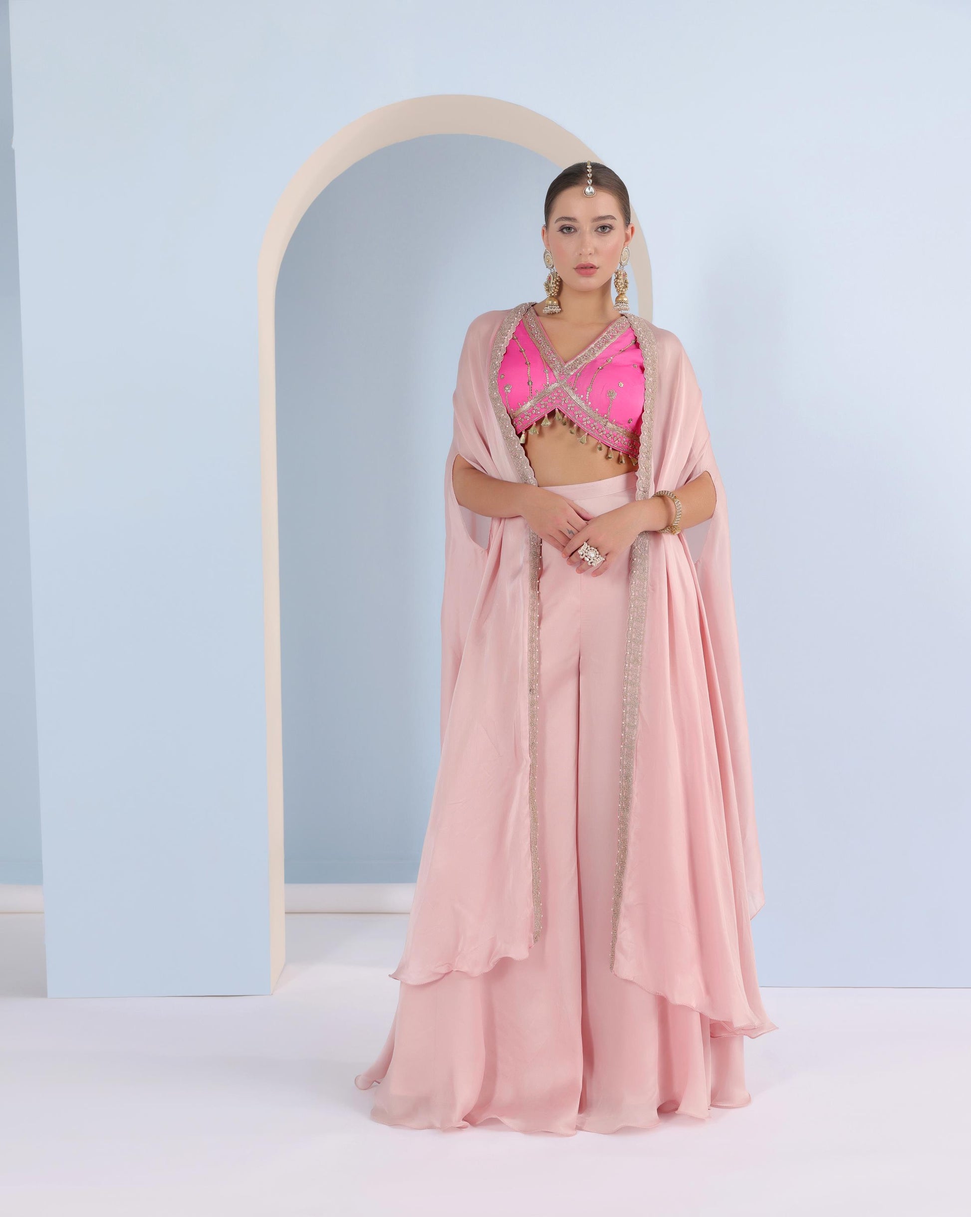 A radiant celebration of femininity, Gulabi Noor features a striking hot pink embroidered blouse adorned with golden zari, sequins, and delicate tassel detailing along the hem. Paired with flowing blush pink palazzo pants and a layered cape-style dupatta edged in scalloped embroidery, this ensemble balances traditional charm with modern elegance. The vibrant blouse stands out against the soft pastel tones, making it an ideal pick for festive soirées, weddings, or special occasions where grace meets glamour.
