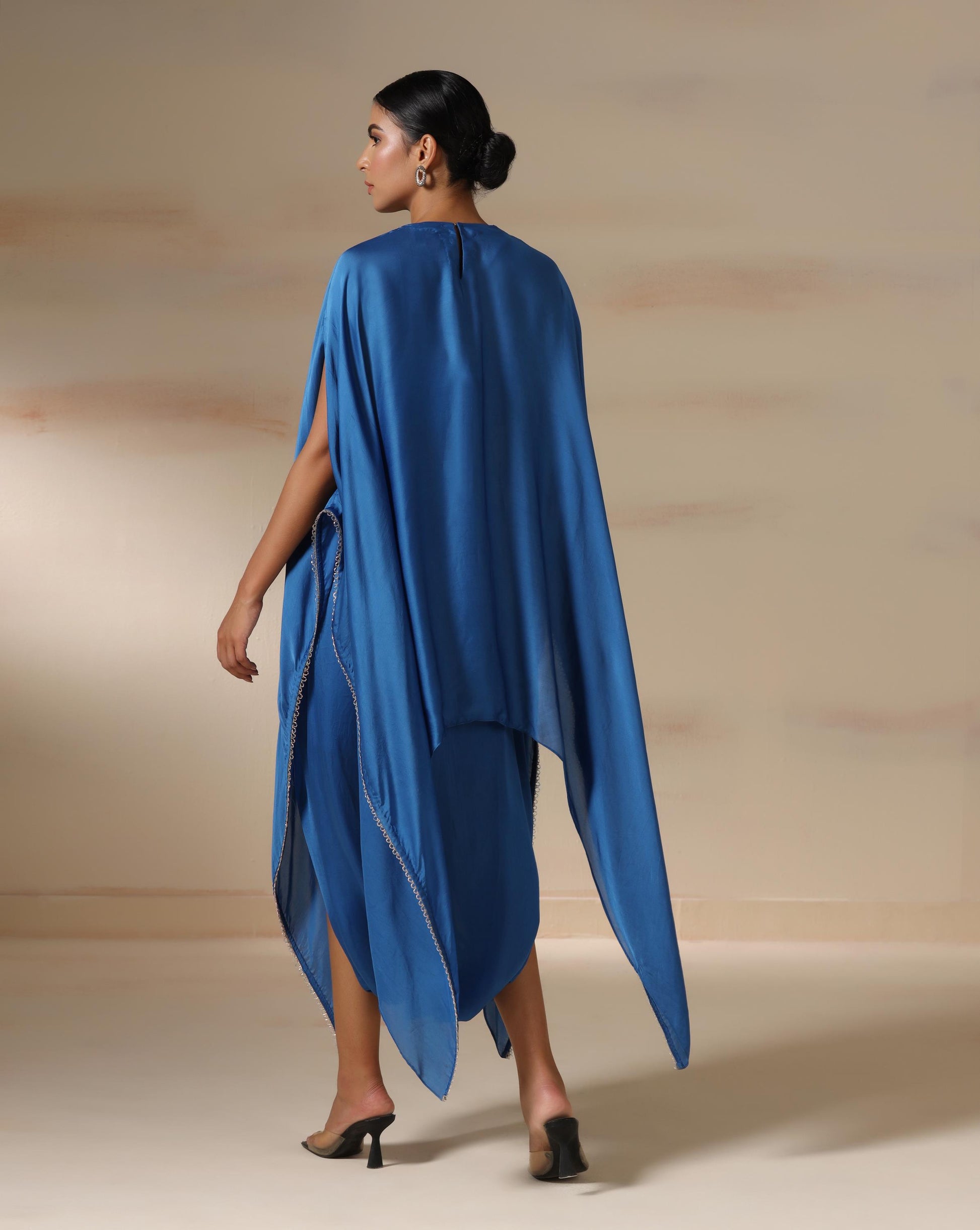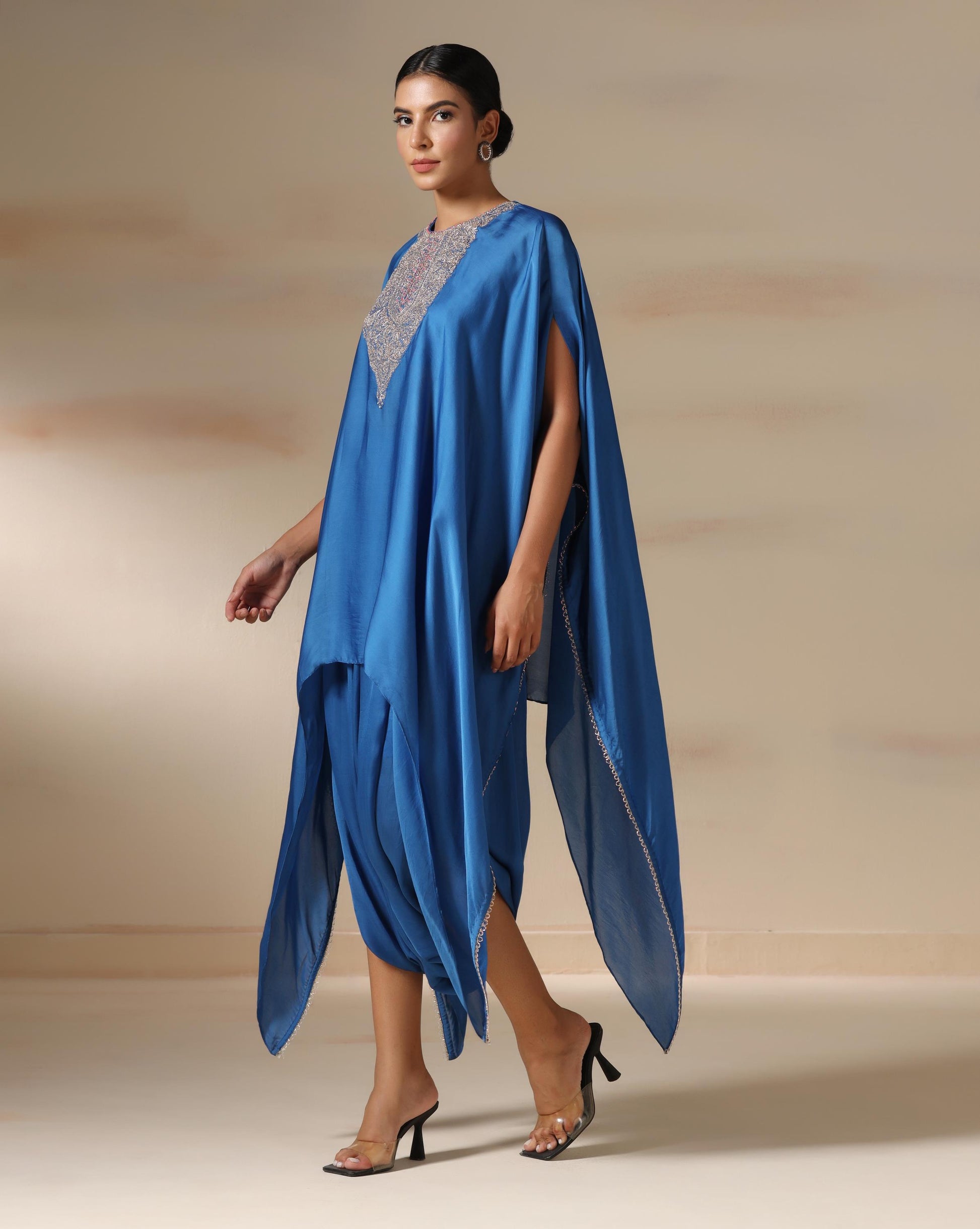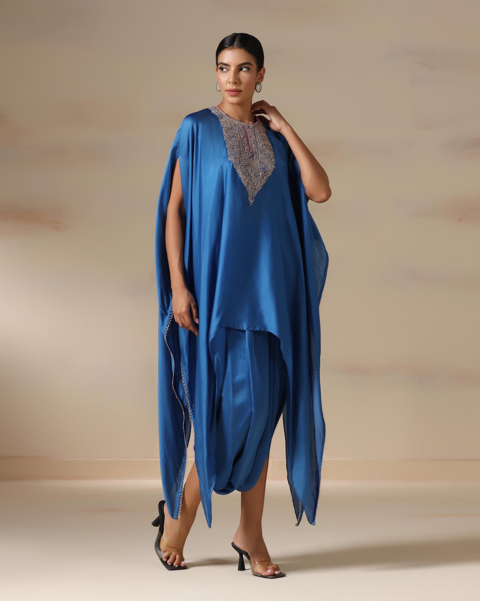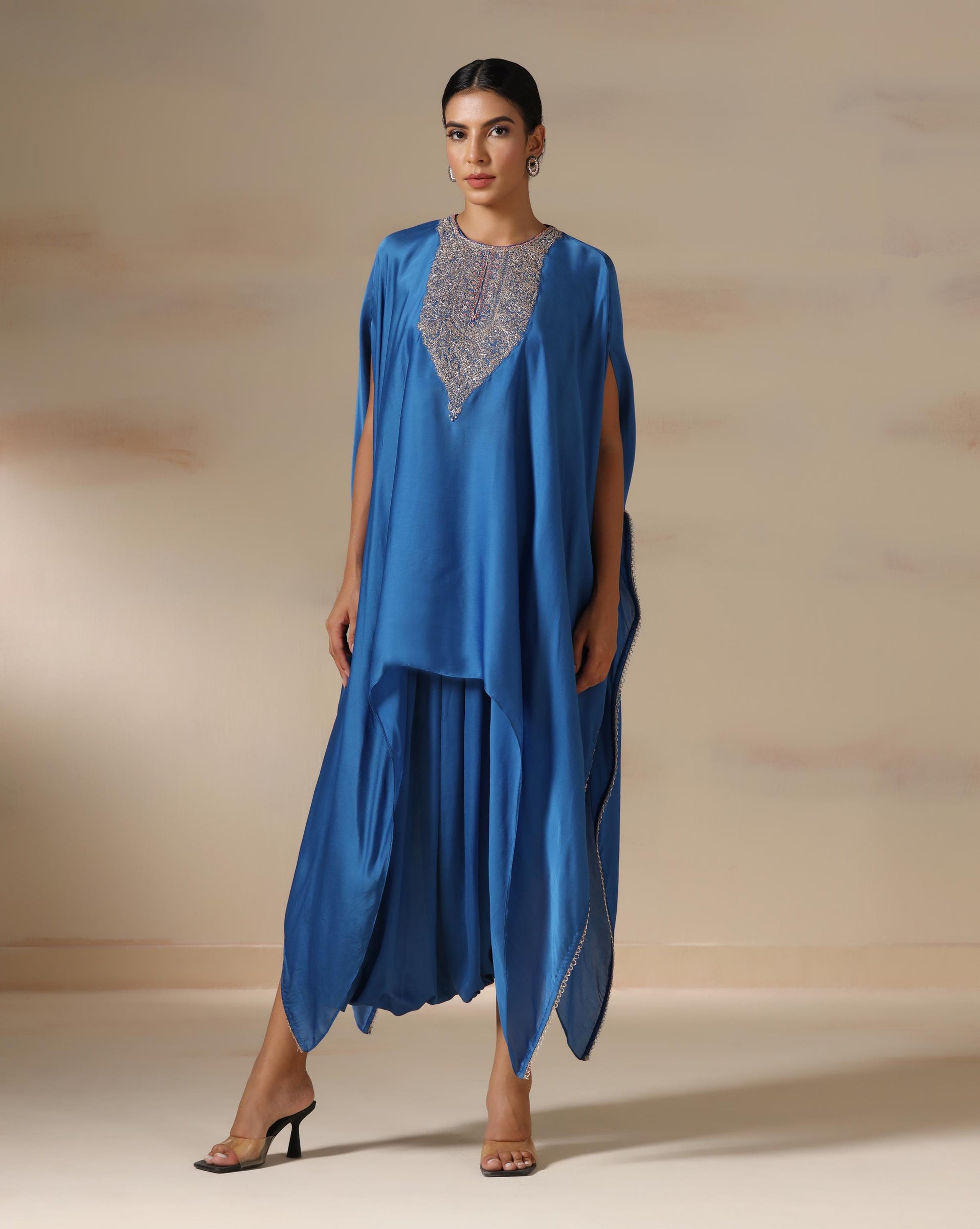 Drape yourself in effortless sophistication with the Azure Elegance Kaftan. Crafted in a rich cobalt blue, this free-flowing silhouette features a hand-embellished neckline with intricate bead and sequin work, adding a touch of regal glamour. The asymmetrical hemline and fluid drape create a graceful movement, while the slit detail offers a contemporary edge. Perfect for festive soirées, evening gatherings, or destination weddings, this kaftan blends comfort with timeless luxury.
