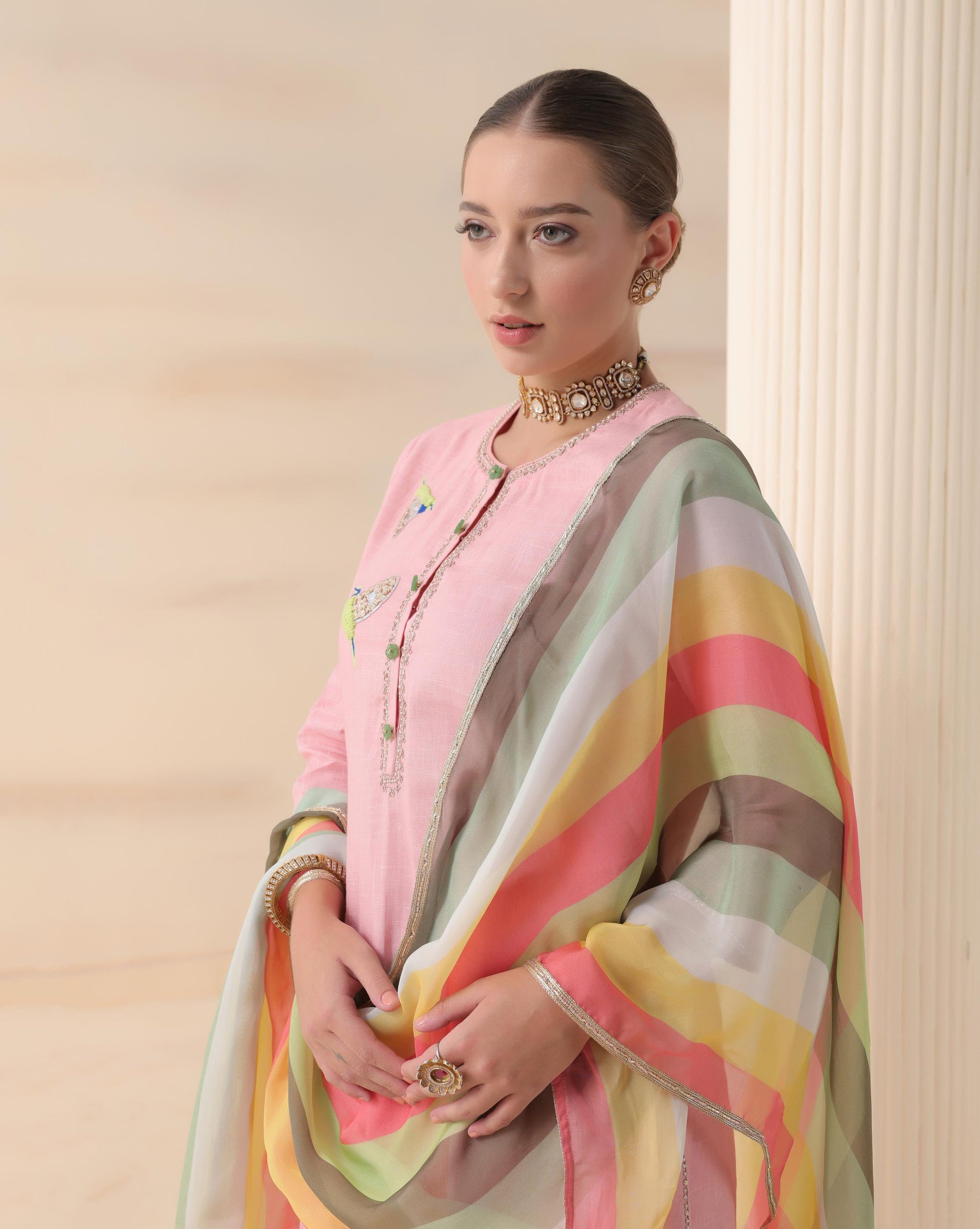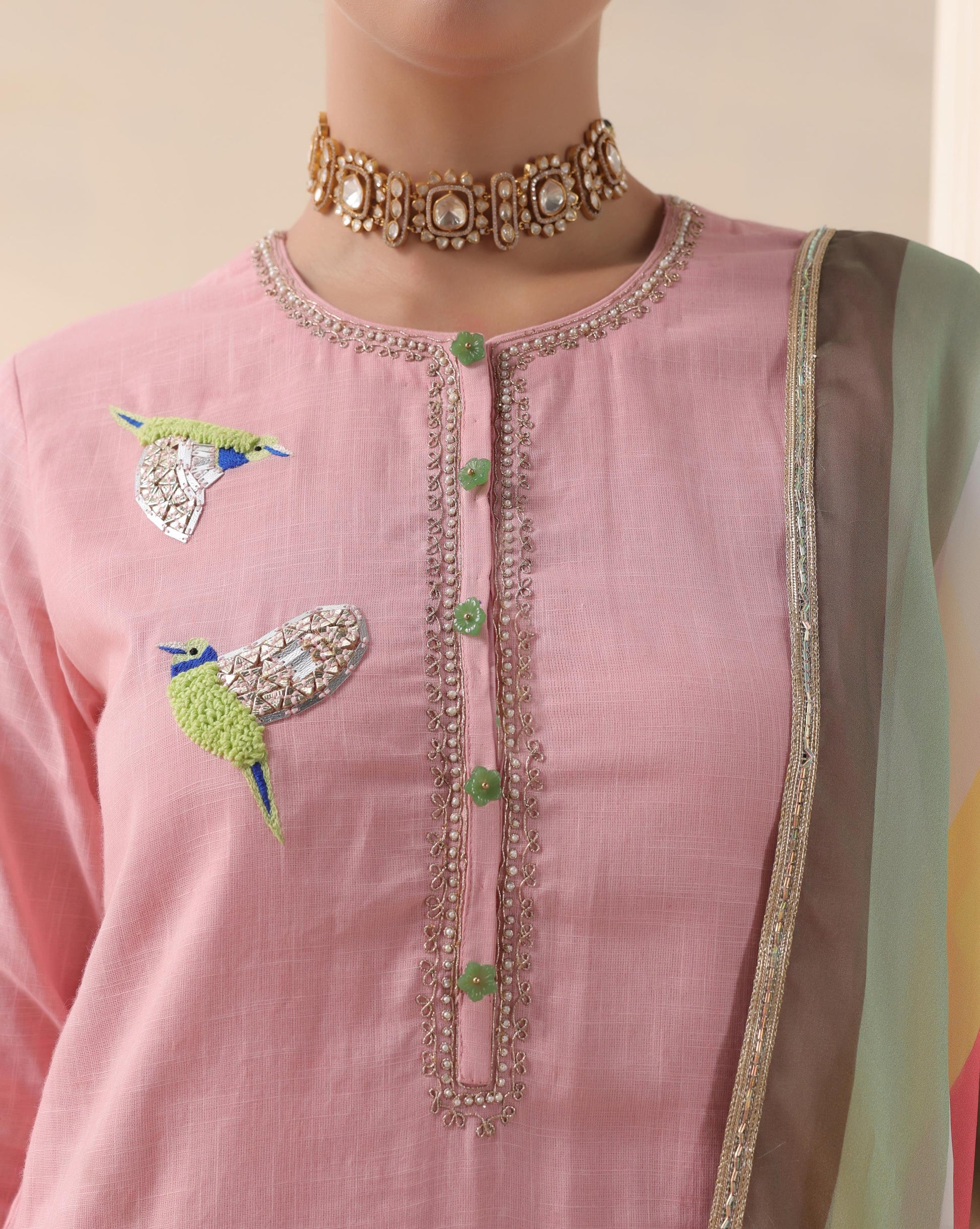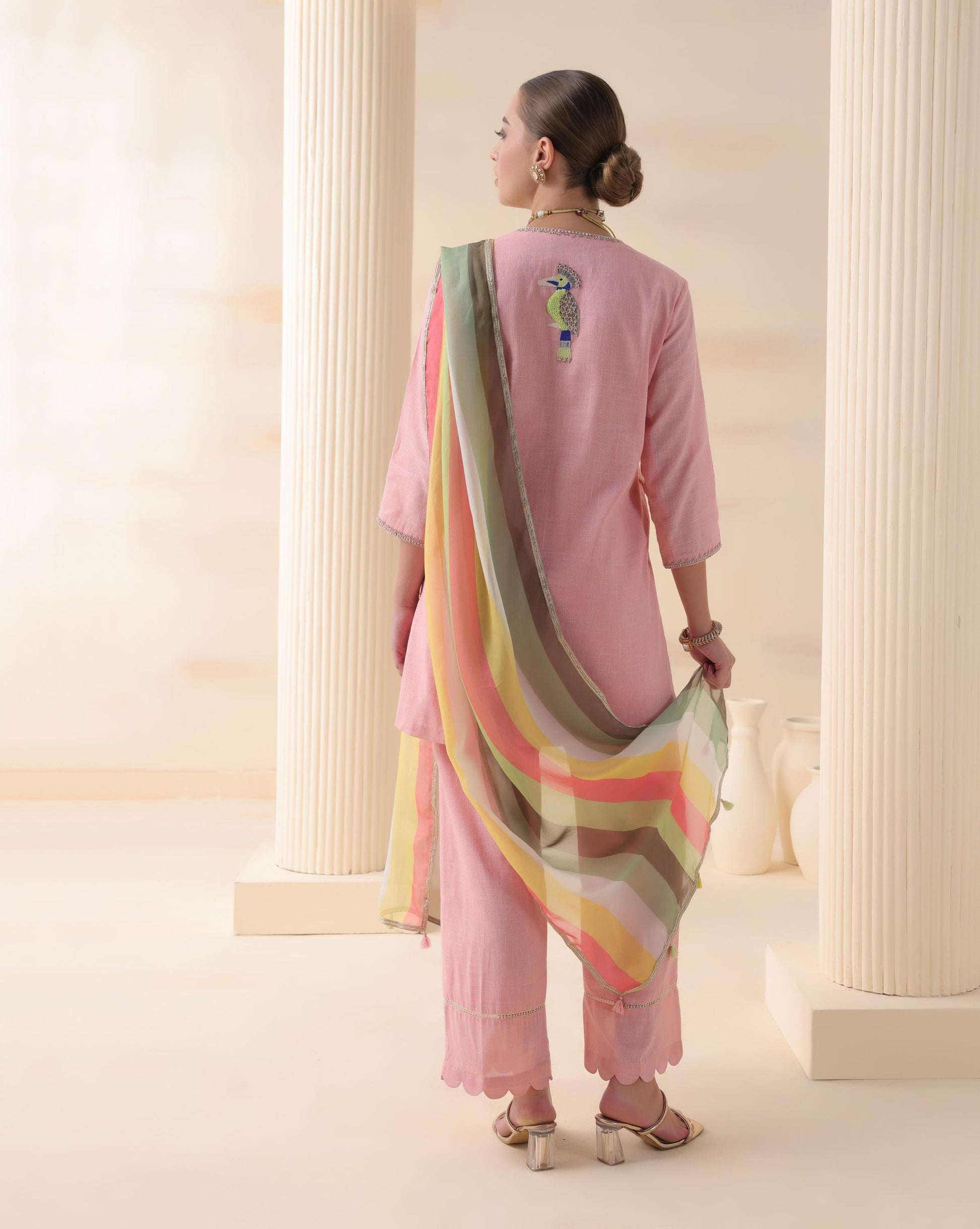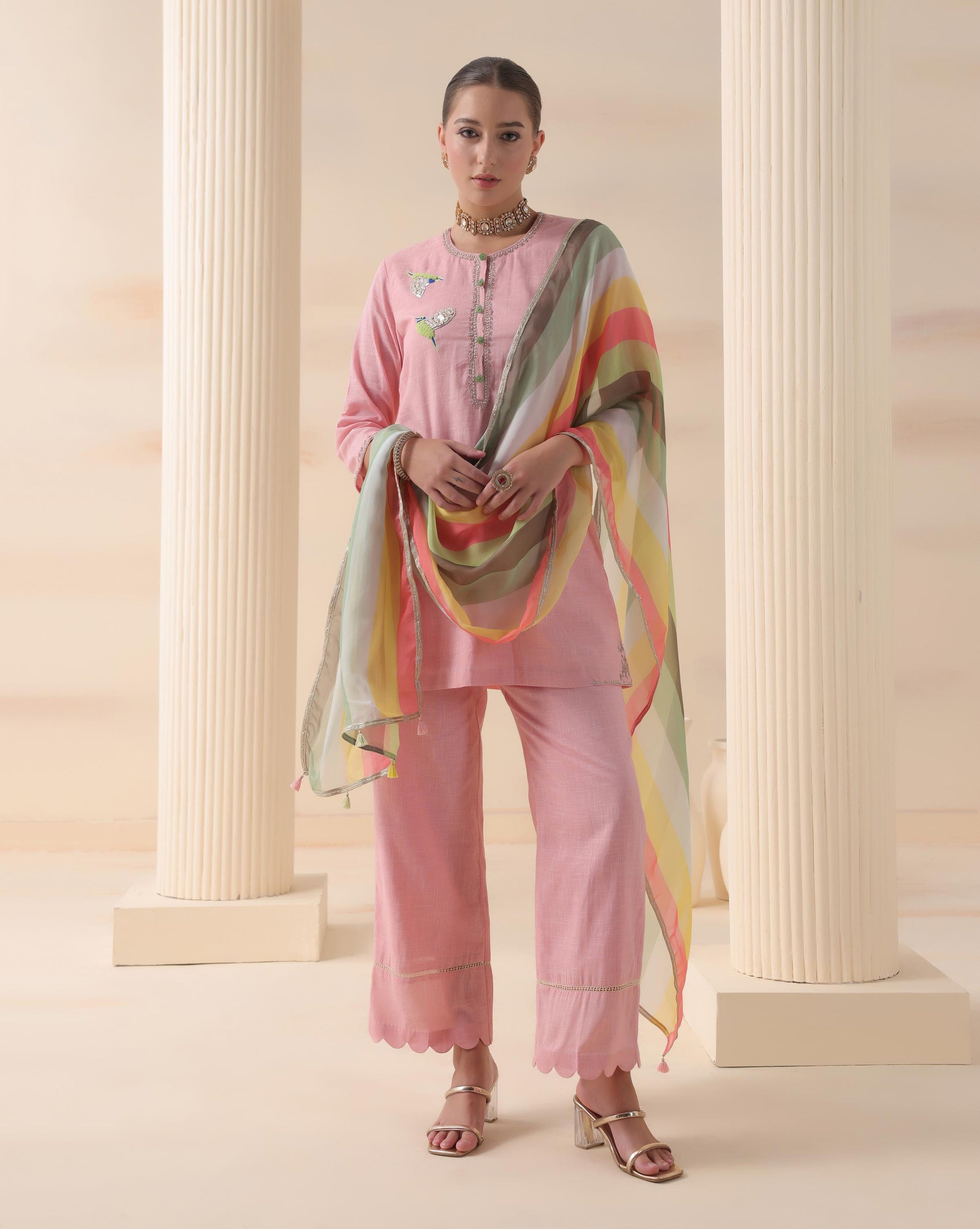 This soft pink kurta set exudes charm and sophistication with delicate bird embroidery that adds a whimsical touch to its minimal silhouette. The kurta features intricate thread and mirror work along the neckline, complemented by scalloped hem trousers that bring a playful yet refined finish. Paired with a pastel striped dupatta in soothing hues of green, yellow, and coral, the ensemble strikes a perfect balance between subtle grace and vibrant energy. Ideal for festive mornings or intimate gatherings, Blush Aviary Elegance is a celebration of tradition reimagined with modern finesse.