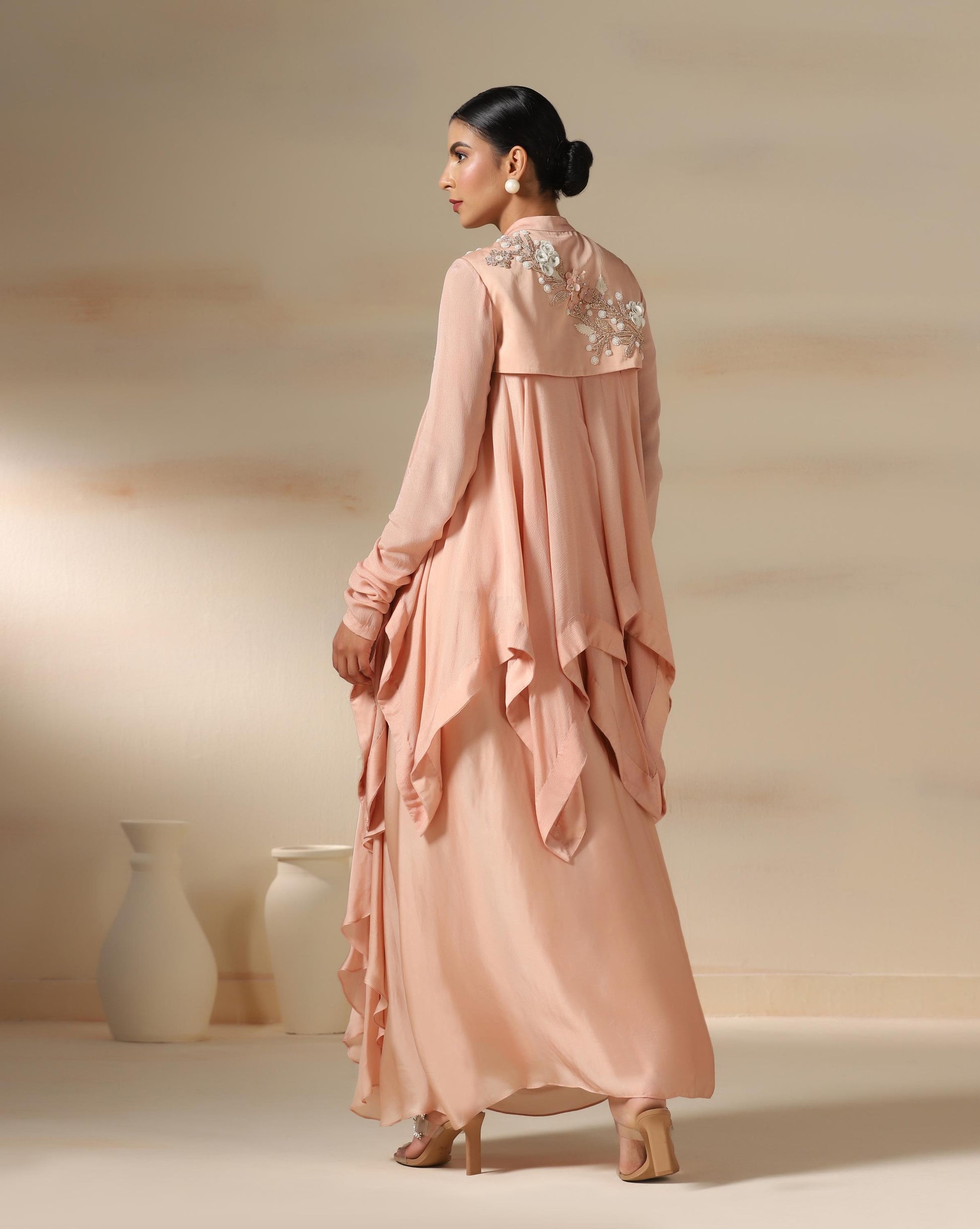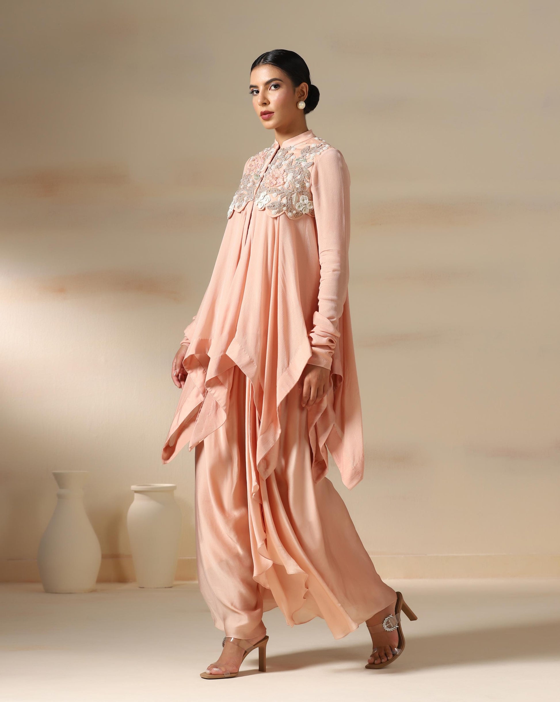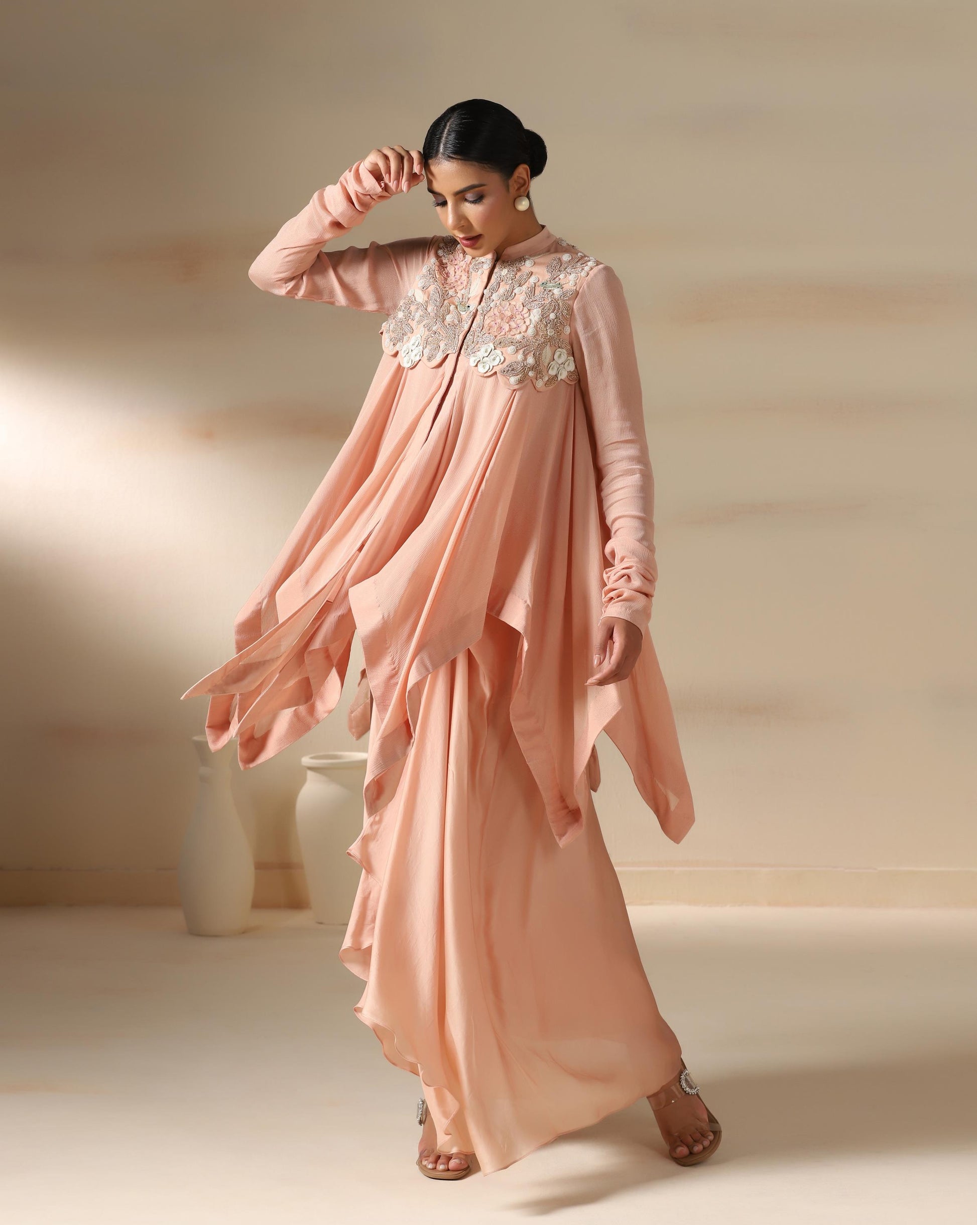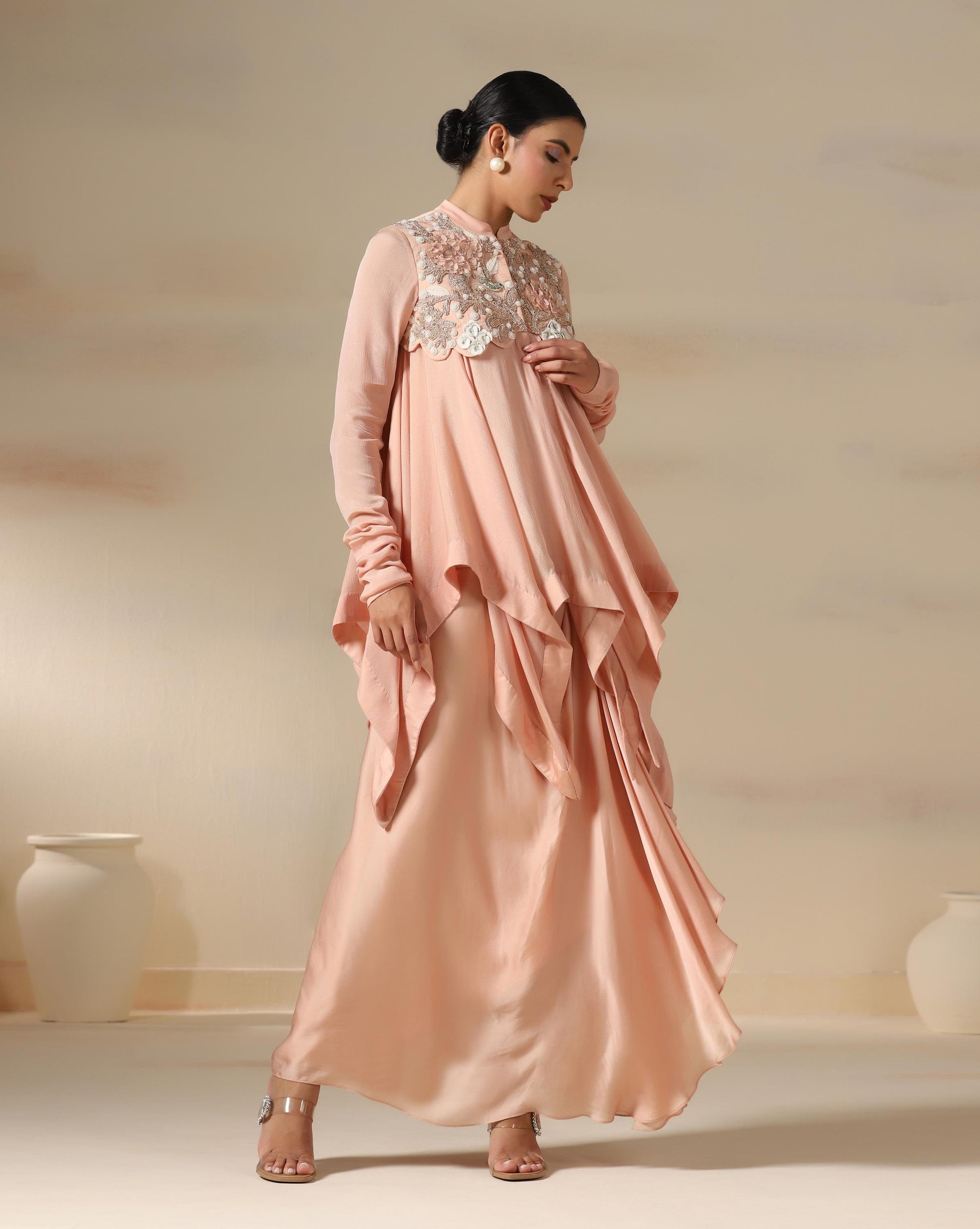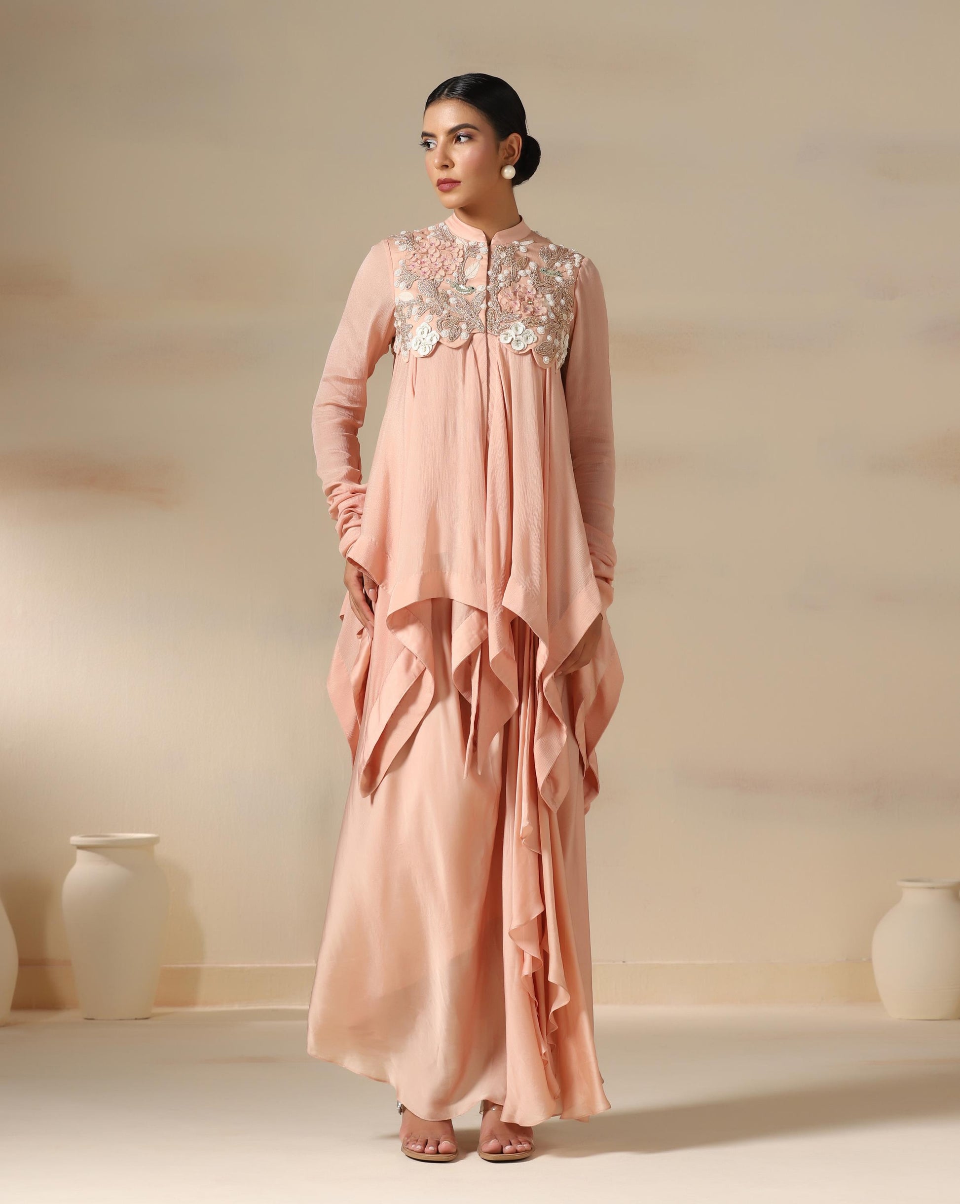 The Blush Petal Cascade is a graceful ensemble in a soft peach hue, exuding elegance with fluid drapes and delicate embroidery. The highlight is the intricately hand-embroidered yoke featuring 3D floral hand work, pearls, and beadwork that bring a touch of artisanal charm. The flowing, layered silhouette creates effortless movement, while the full sleeves add modest sophistication. Perfect for festive soirées or elegant celebrations, this outfit beautifully blends contemporary draping with timeless feminine detailing.