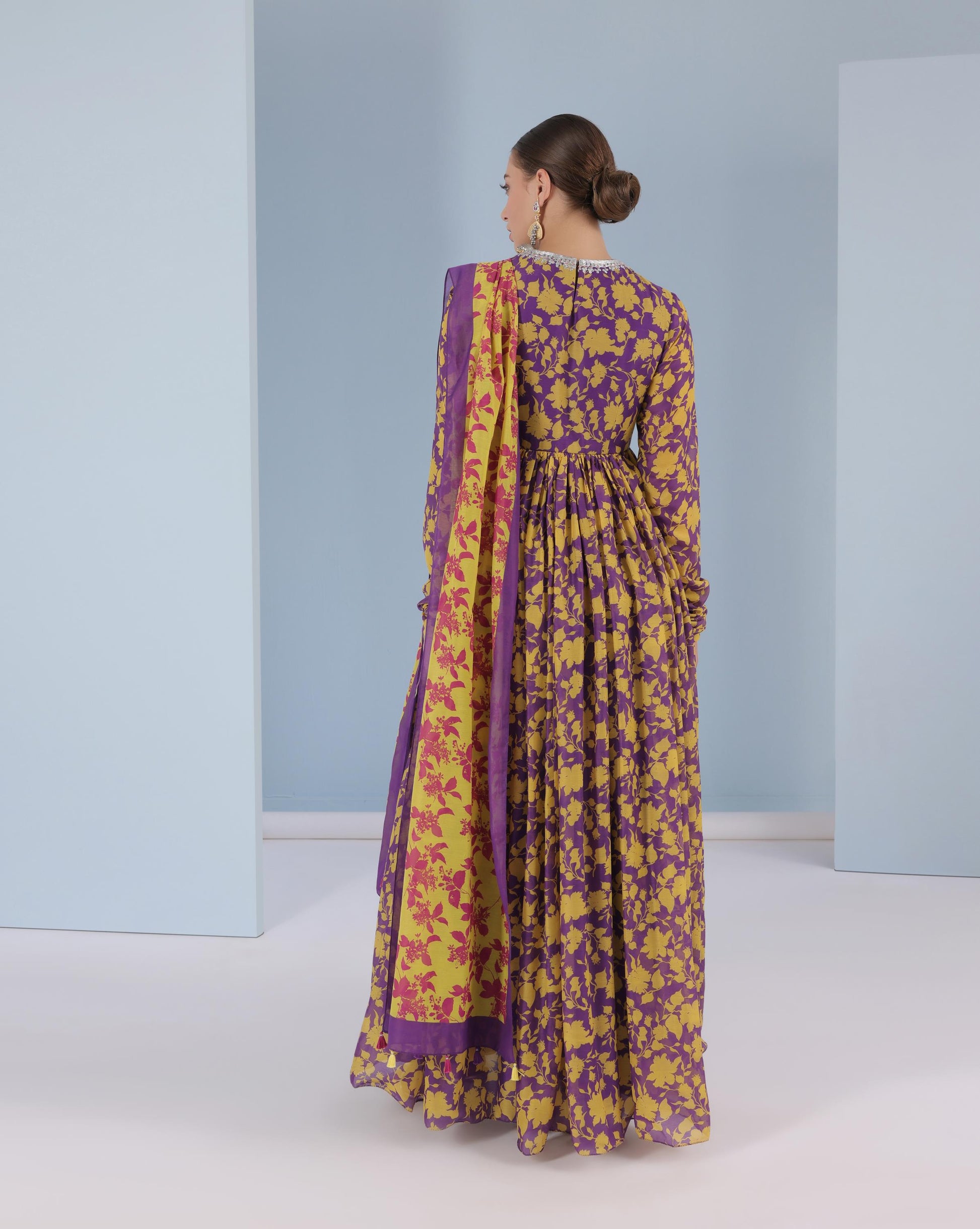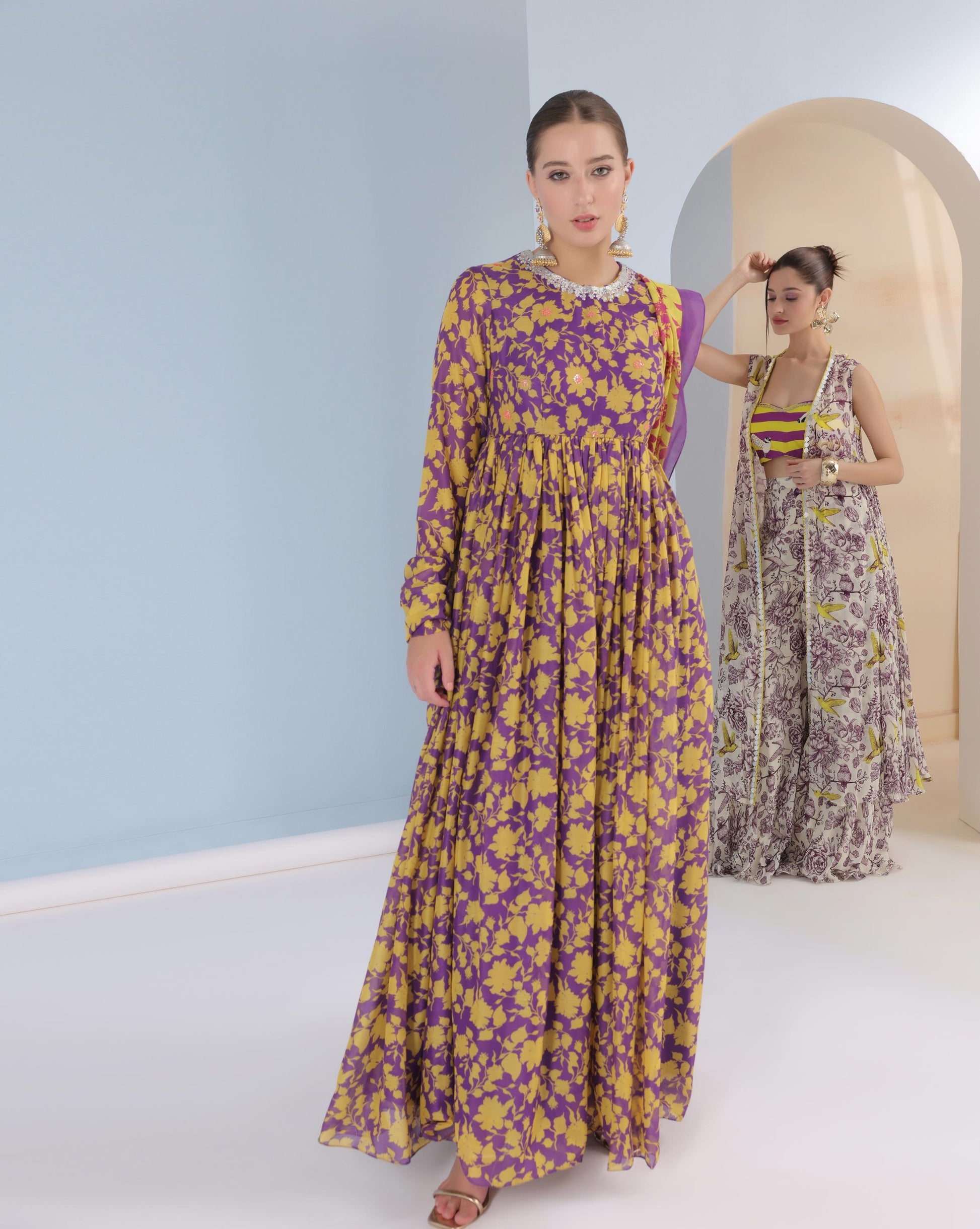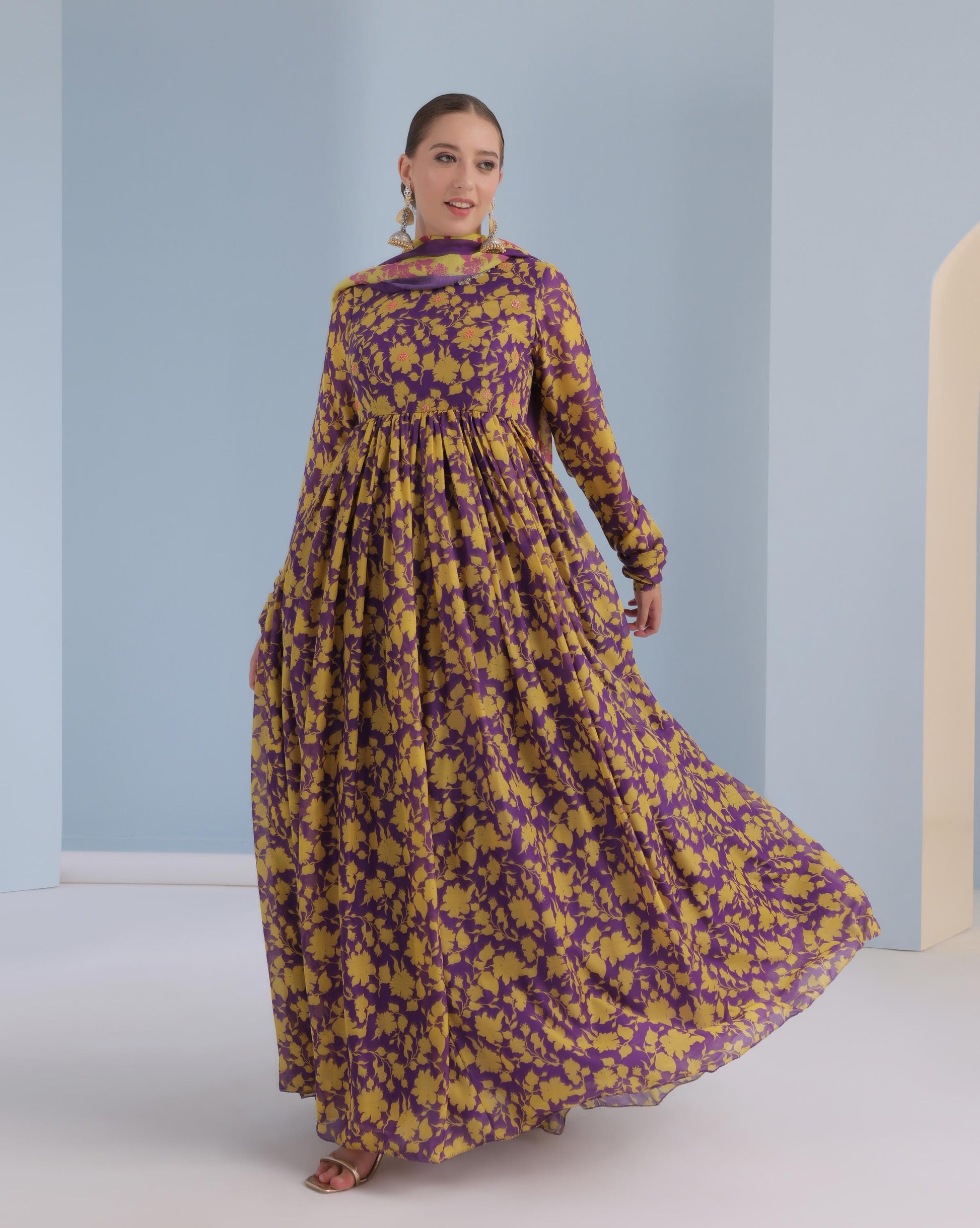 The Golden Orchid Maxi Dress is a radiant ode to floral elegance, blending bold hues with timeless charm. Crafted in a striking royal purple base adorned with golden-yellow floral prints, this flowing maxi dress captures attention with its effortless grace.