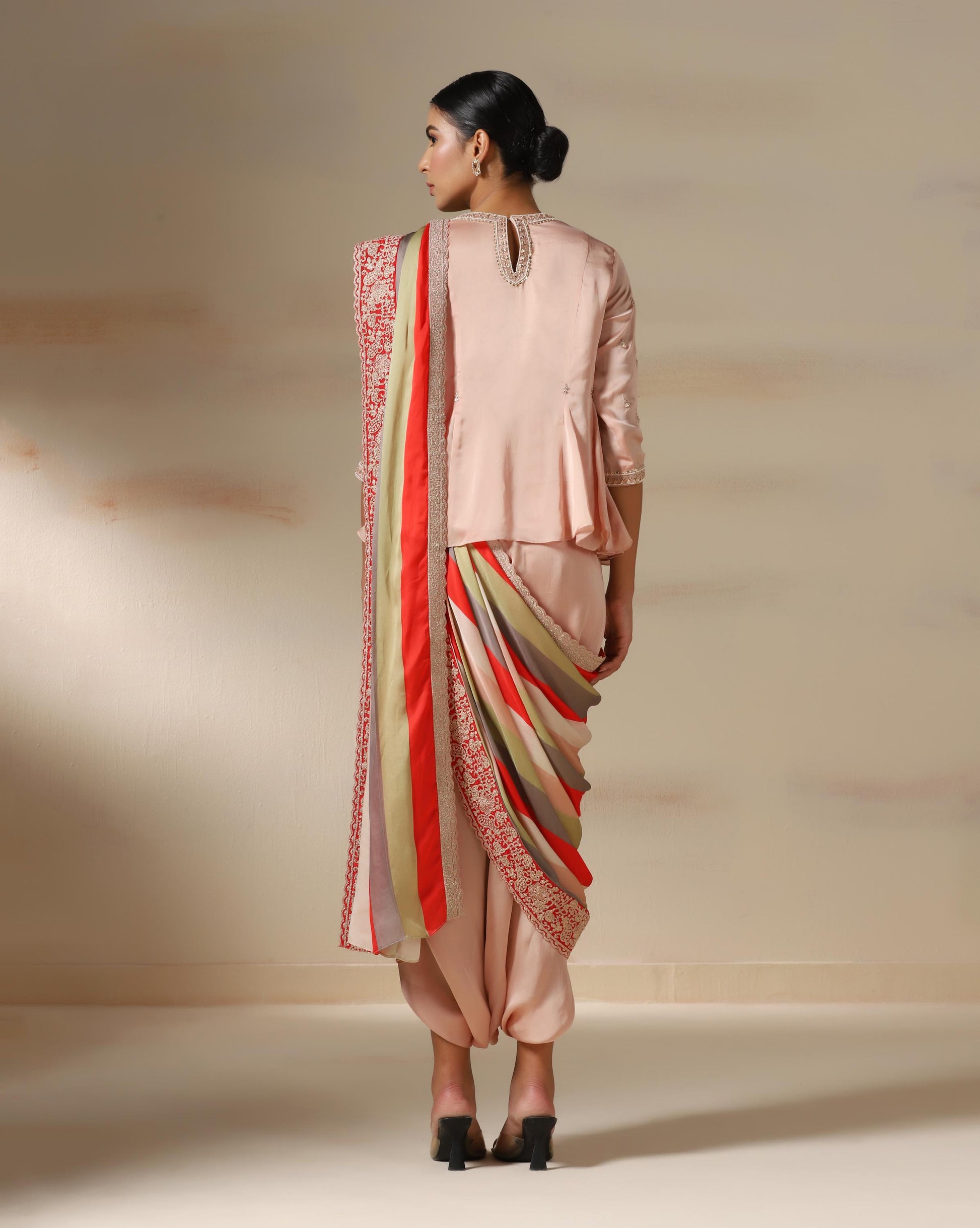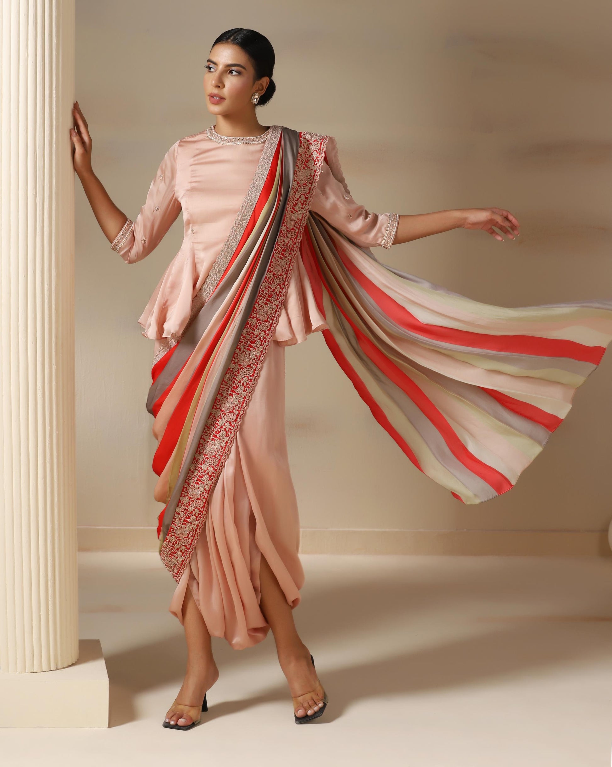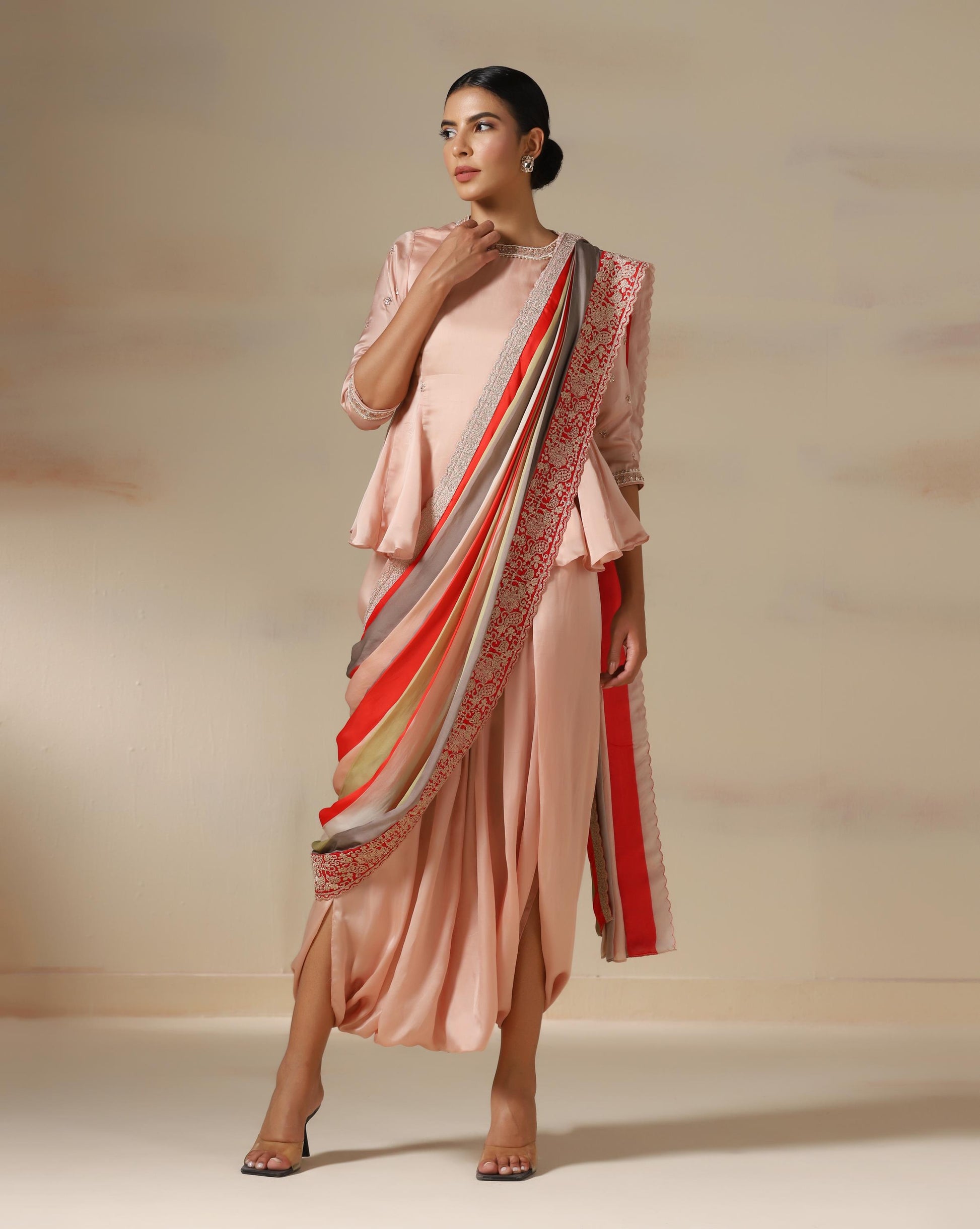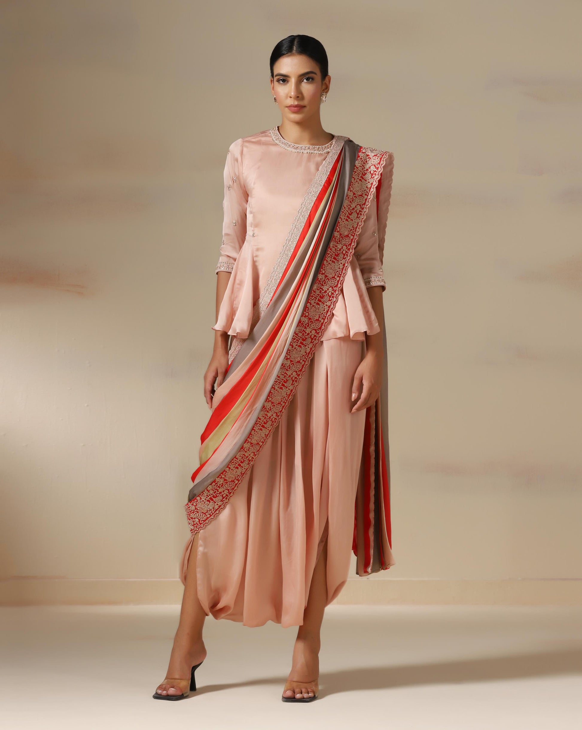 The Blush Royale Drape Ensemble is a stunning fusion of modern tailoring and traditional elegance. The structured peplum top features pearl and sequin embellishments at the neckline and sleeves, adding a touch of regal charm. Paired with a fluid draped skirt, the highlight of this outfit is the opulent striped dupatta—accented with coral red, muted gold, and taupe tones, finished with an intricately embroidered border in resplendent silver threadwork. Perfect for festive occasions, weddings, or evening soirées, this ensemble embodies understated luxury with a graceful, contemporary twist.