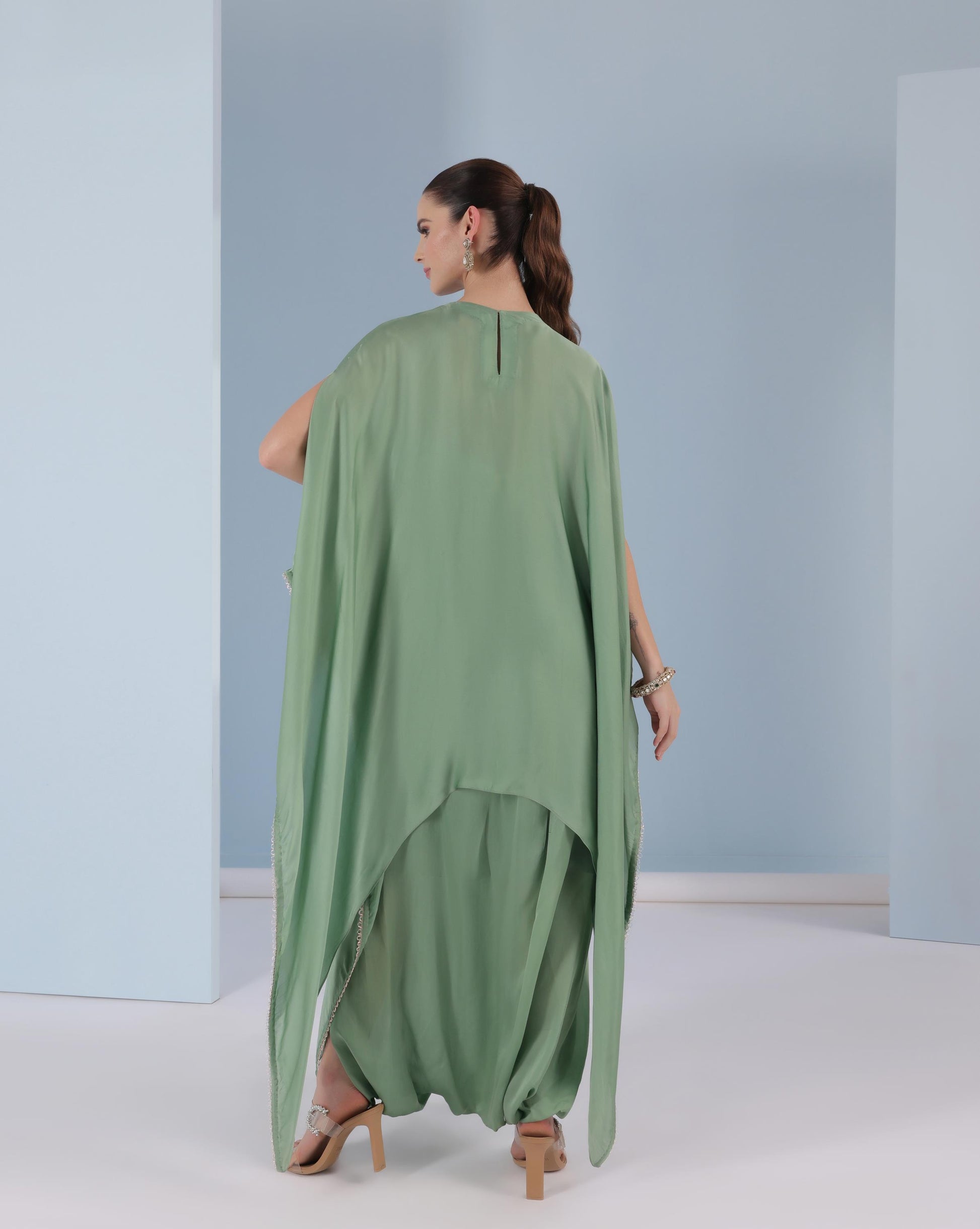 The Sage Mirage Kaftan Gown is an ethereal blend of fluidity and understated luxury. Designed in a serene sage green hue, the silhouette drapes effortlessly with a high-low hemline and flowing layers that move like poetry. The relaxed kaftan fit offers both comfort and grandeur, making it versatile for festive evenings or destination celebrations.