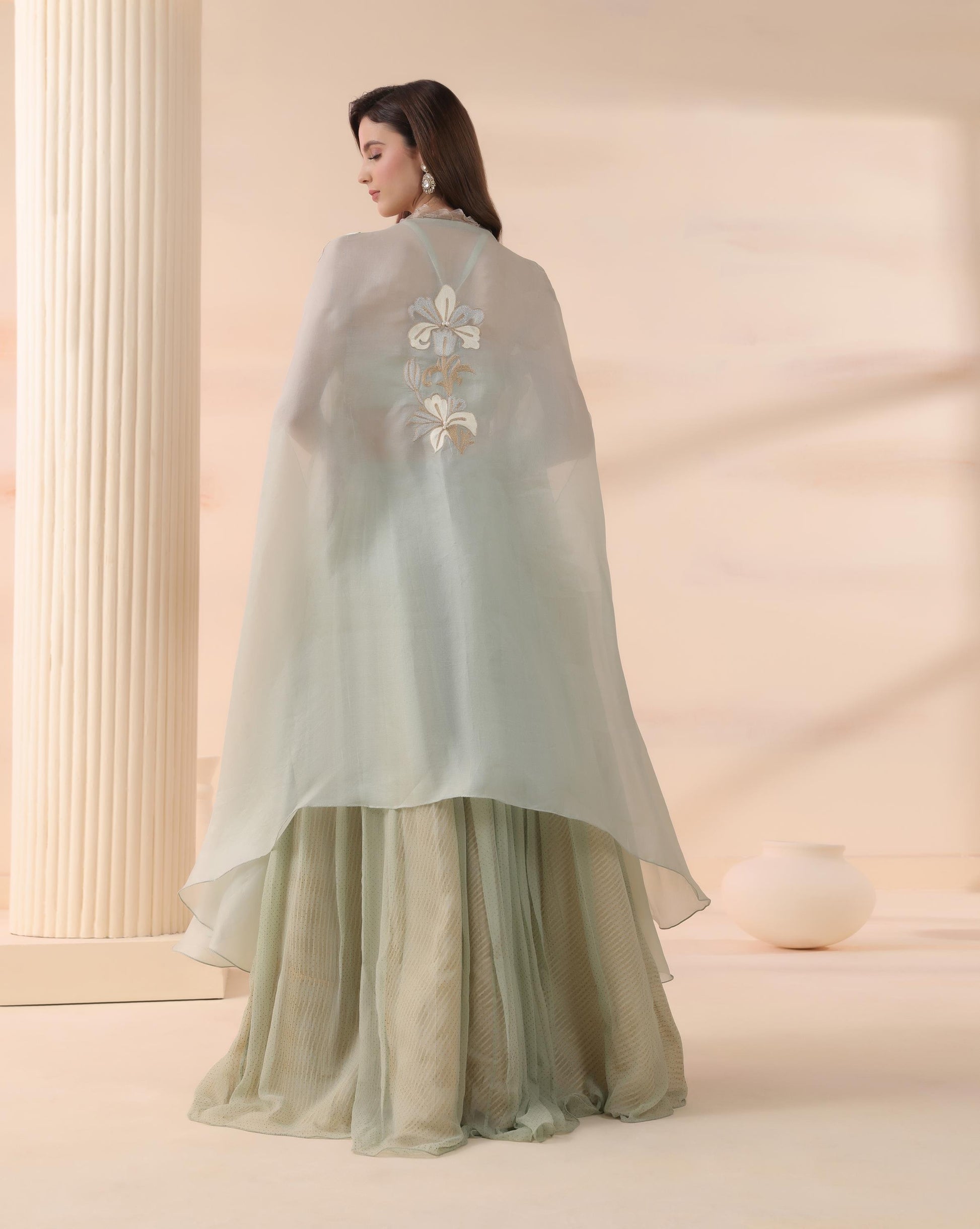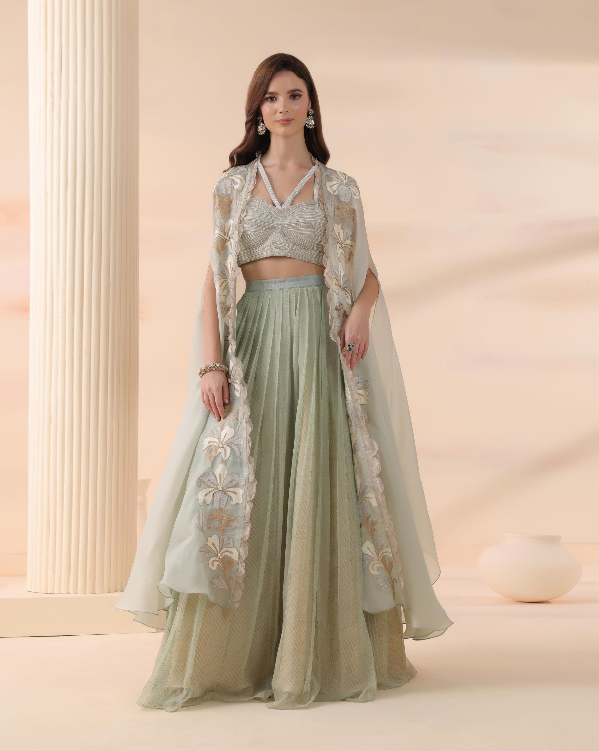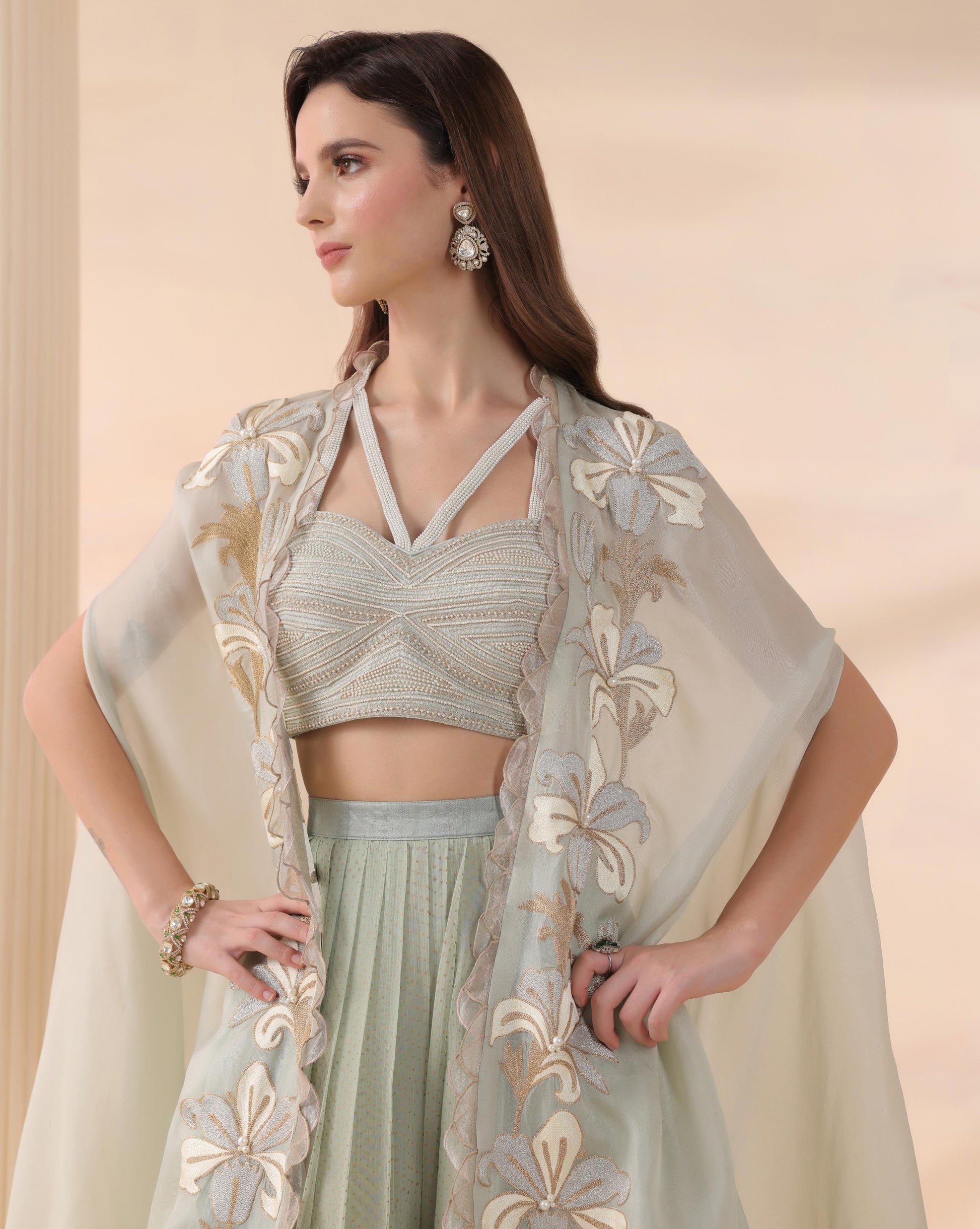 A serene ode to sophistication, the Mint Whisper Ensemble pairs ethereal hues with exquisite craftsmanship. The delicately embroidered halter blouse shimmers with tonal threadwork and bead detailing, creating a structured yet feminine silhouette. Flowing into a voluminous pleated skirt in soft mint, the outfit exudes grace and movement. The sheer cape overlay, adorned with intricate ivory and gold floral embroidery, frames the look with regal charm. Perfect for festive soirées and elegant occasions, this ensemble blends contemporary finesse with timeless elegance.
