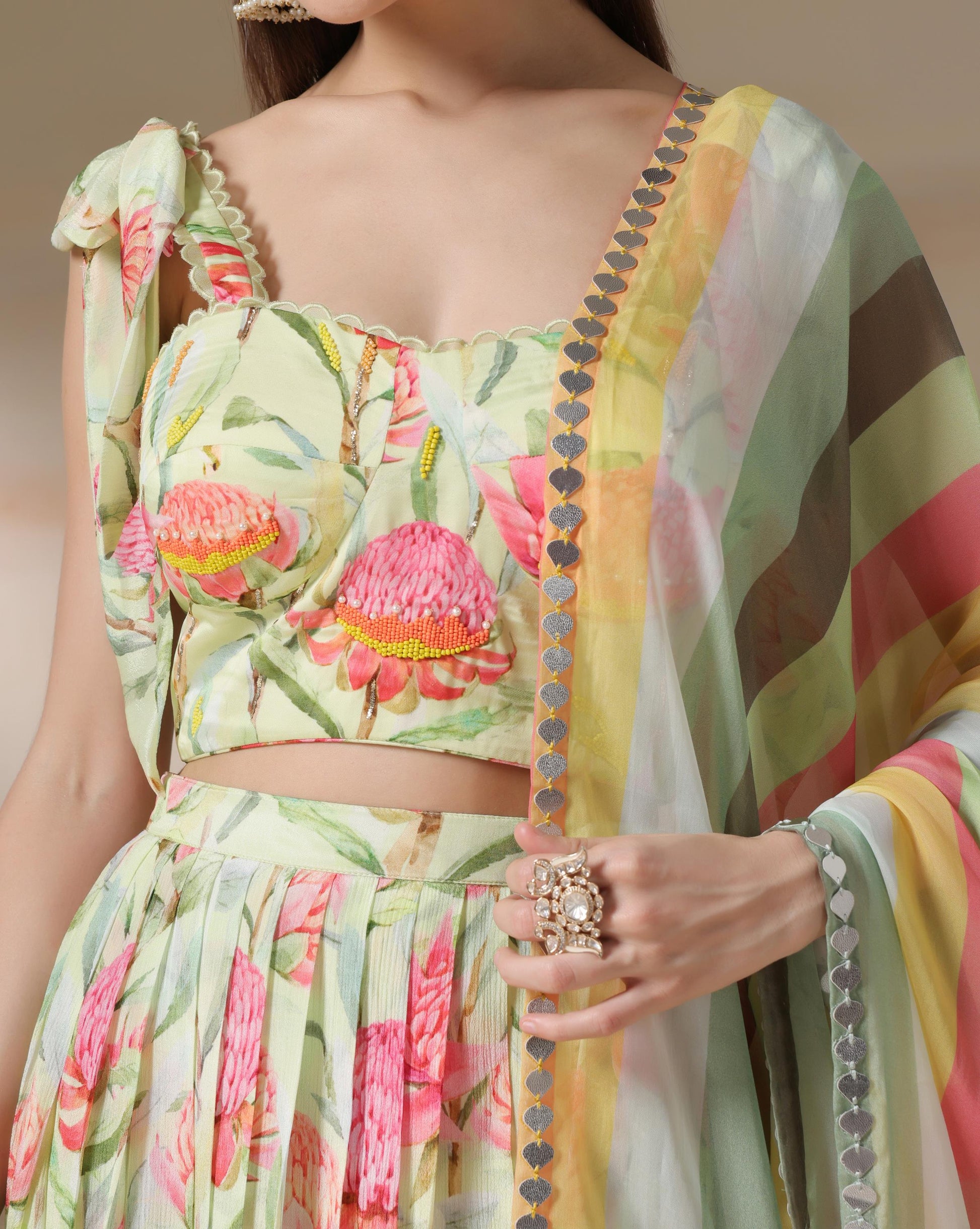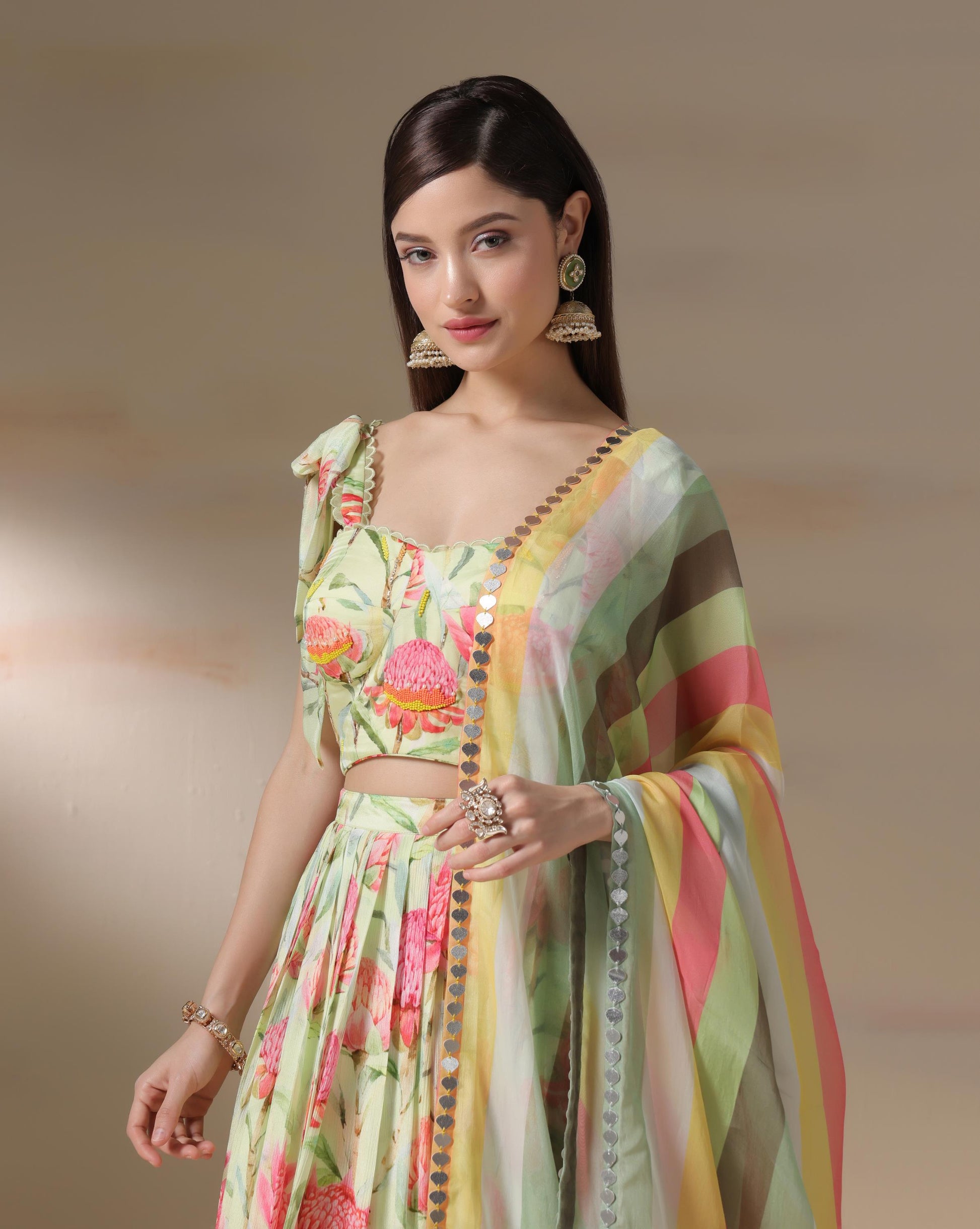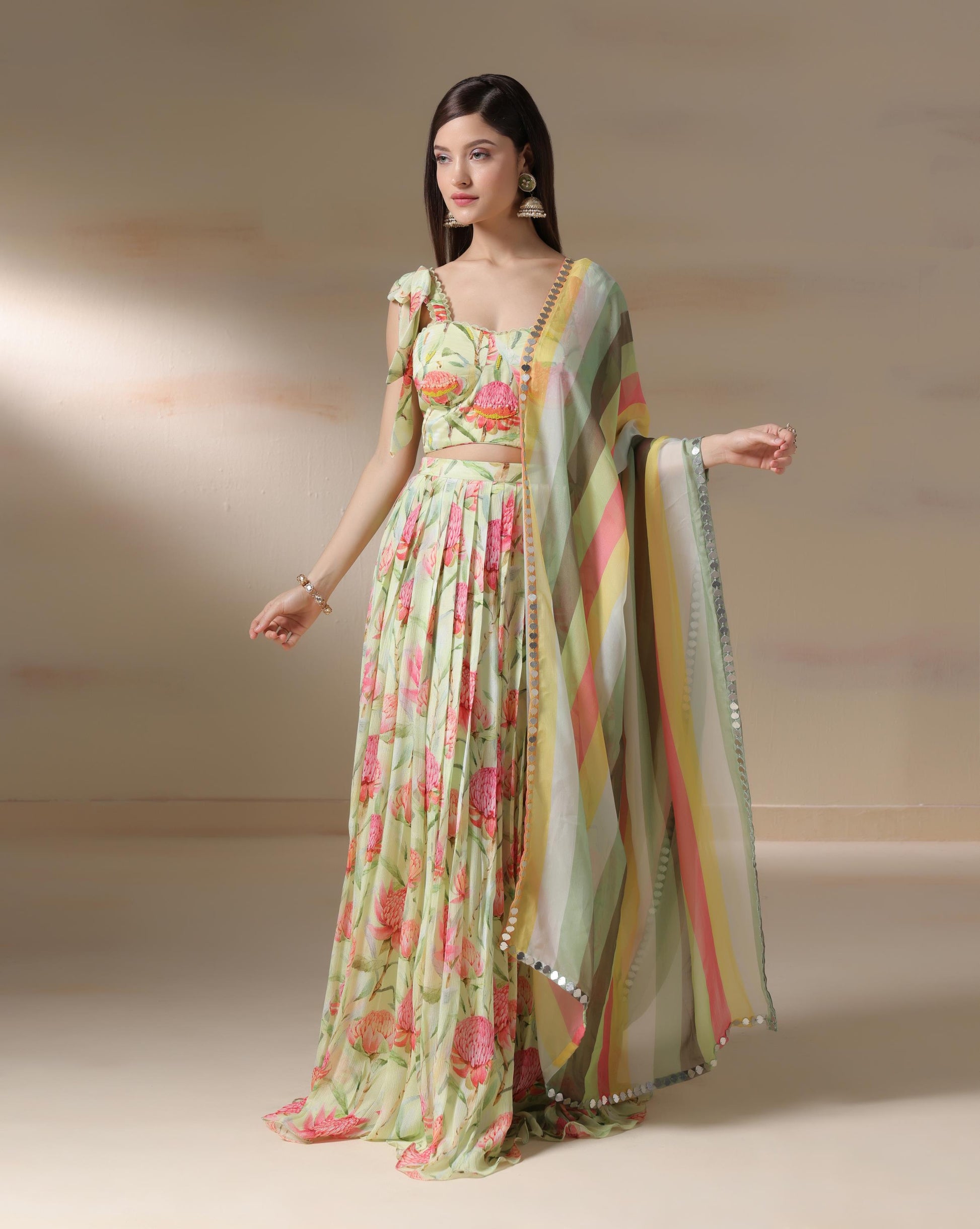 A refreshing ode to spring, this lehenga set is crafted in a pastel green base adorned with bold pink floral prints. The sweetheart neckline blouse with delicate tie-up shoulder straps adds a playful charm, while the pleated flowy skirt brings effortless grace. Paired with a striped multicolored dupatta featuring mirror-detailed edging, this ensemble strikes the perfect balance between youthful vibrance and timeless tradition. Ideal for daytime weddings, festive celebrations, or garden soirées, this look blossoms with elegance and liveliness.