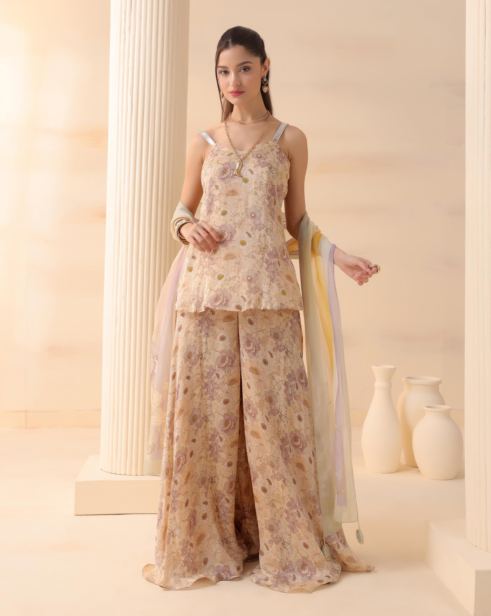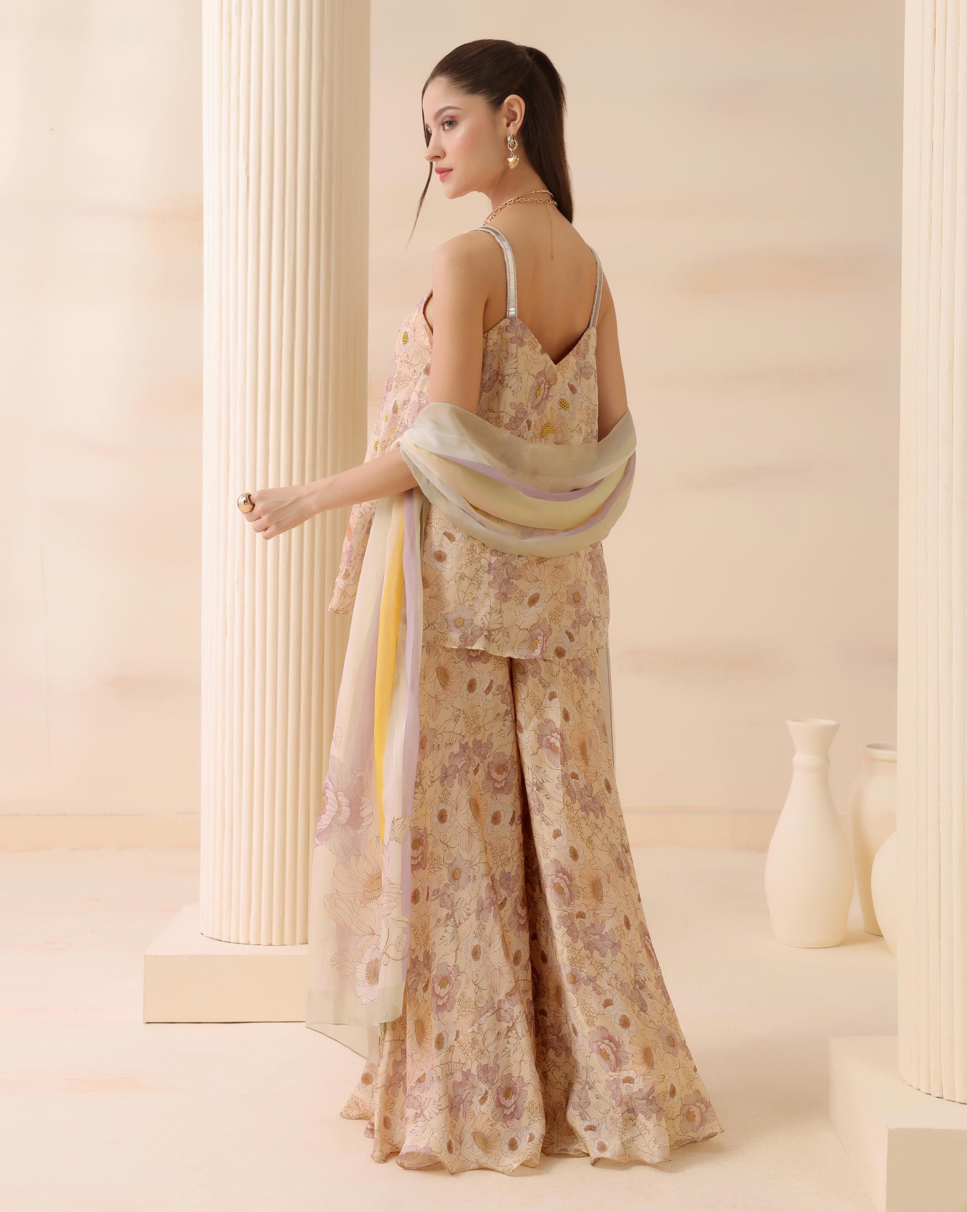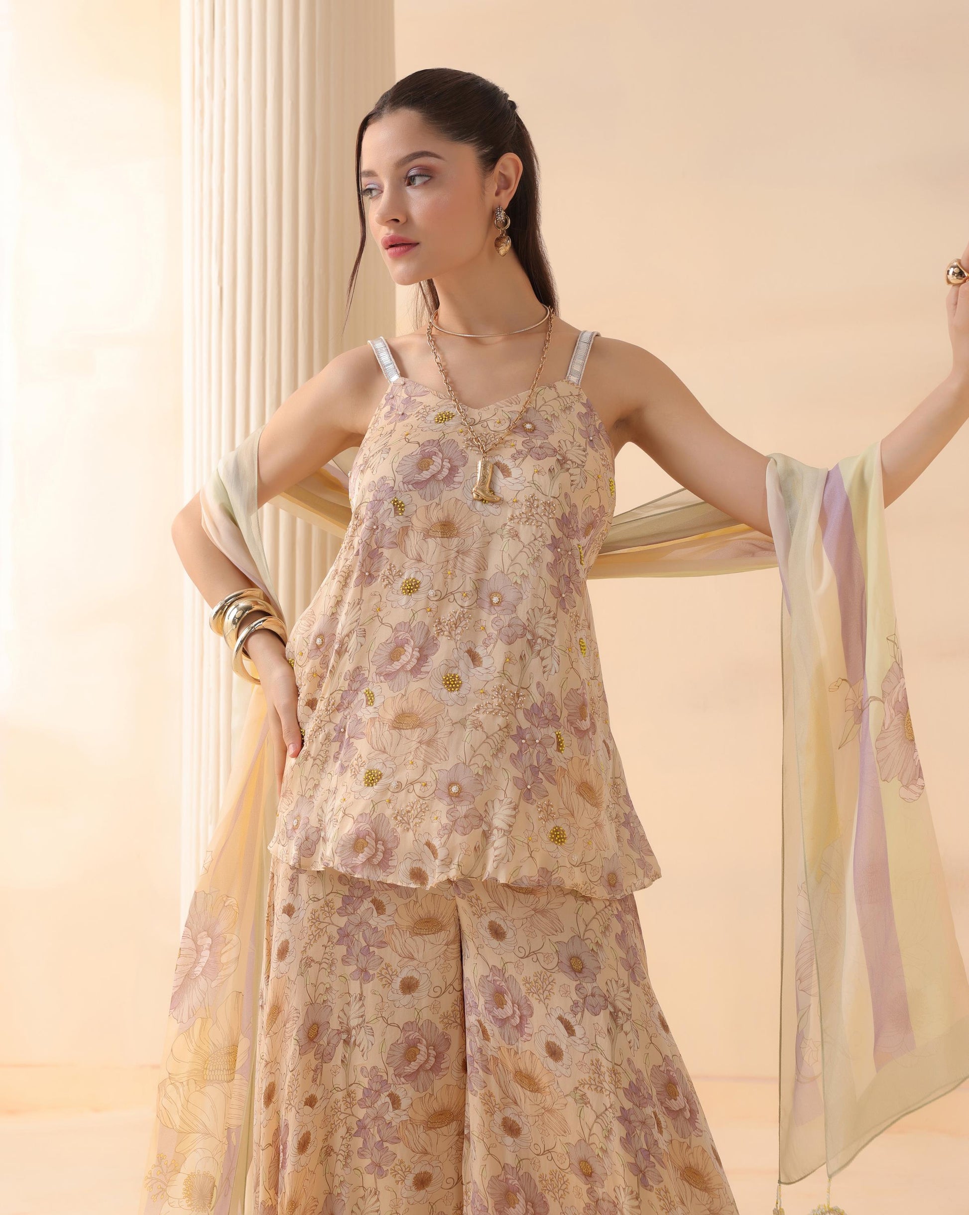 A breezy and elegant set that embodies effortless chic. The sleeveless camisole top features delicate silver straps paired with a flowy silhouette, while the wide-legged palazzo pants showcase an all-over floral print in soft beige, lilac, and muted gold tones. Subtle sequin and thread detailing add a hint of sparkle, making it versatile for both daytime charm and evening grace. Styled with a sheer pastel dupatta in shades of yellow and lilac, this ensemble is perfect for summer soirées, festive gatherings, or destination weddings.