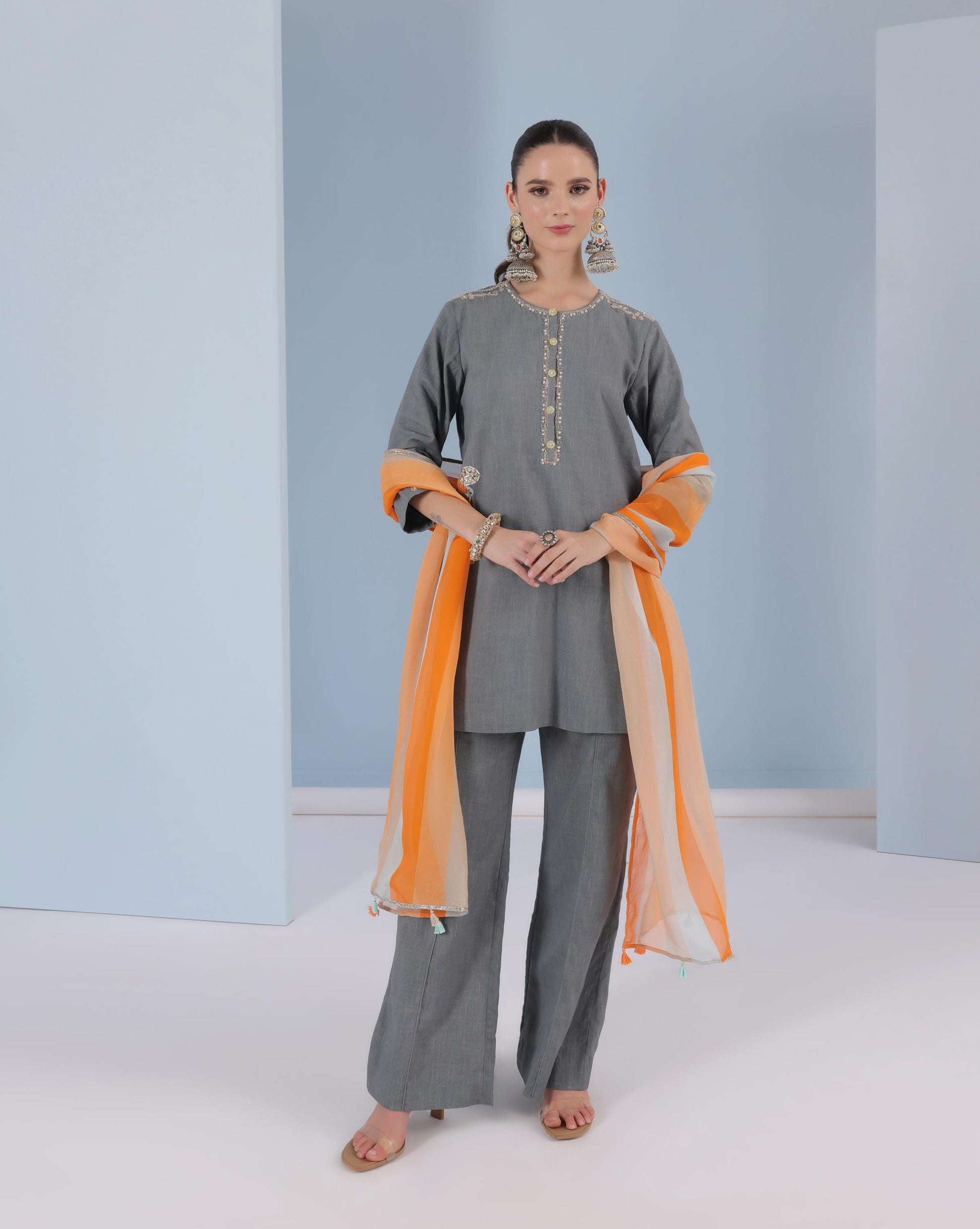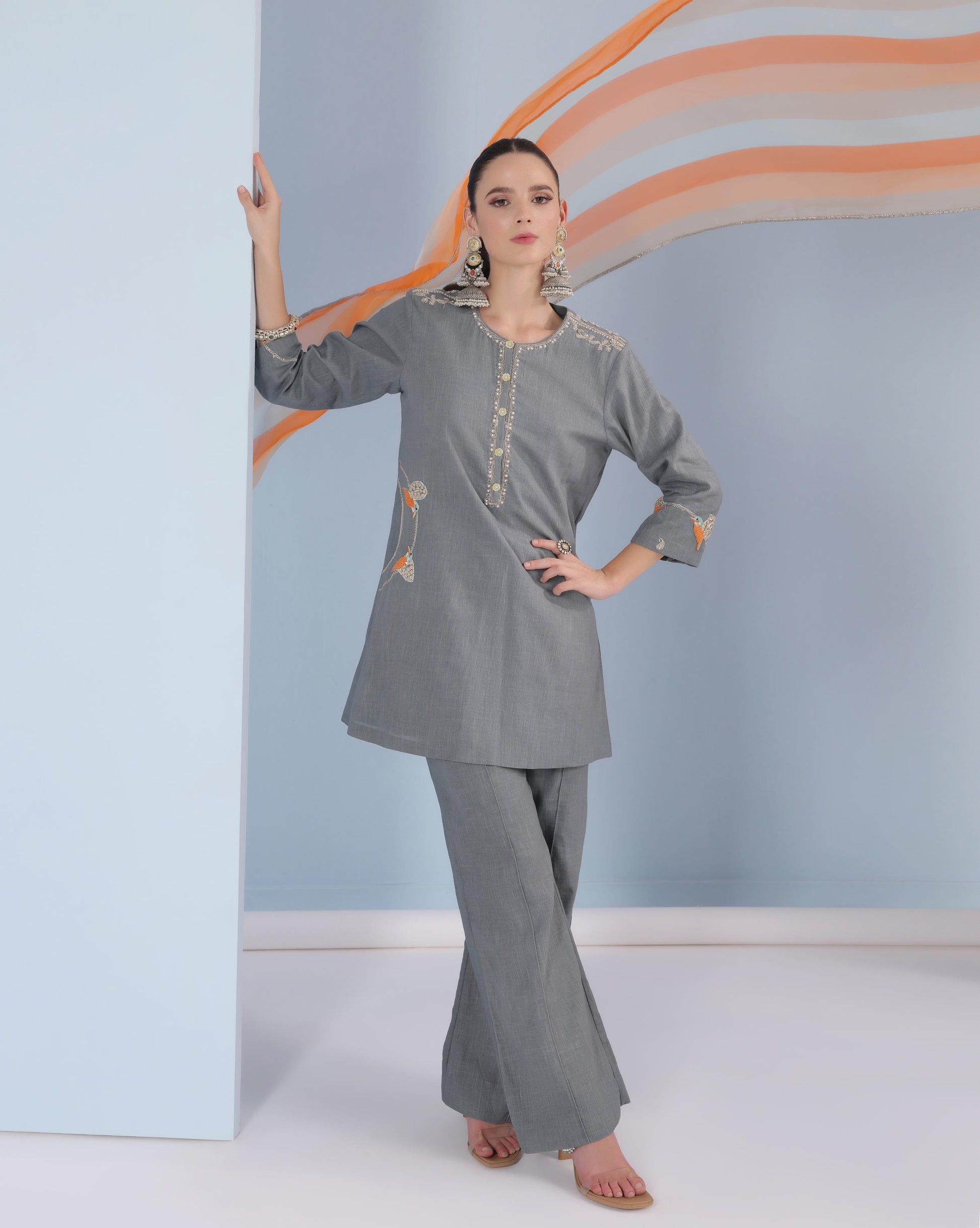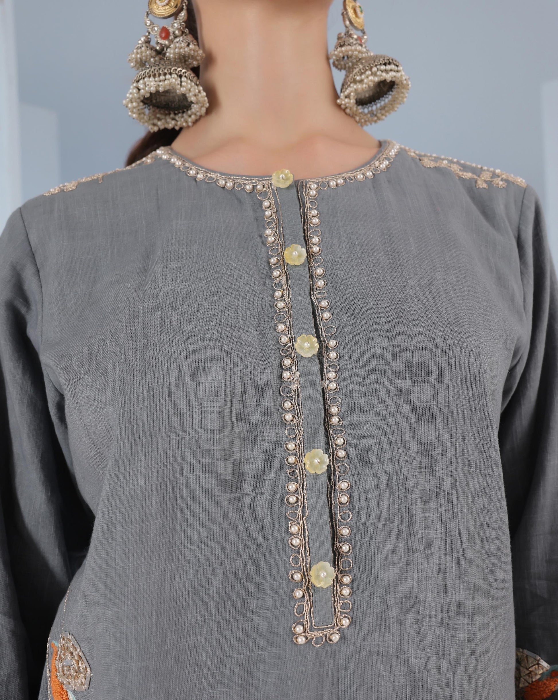 The Smoky Pearl Kurta Set is a timeless expression of understated luxury, blending minimal elegance with handcrafted detailing. Made in a refined slate-grey fabric, the straight-cut kurta is adorned with delicate mirror work and pearl-embroidered buttons, creating a subtle shimmer against the matte base.