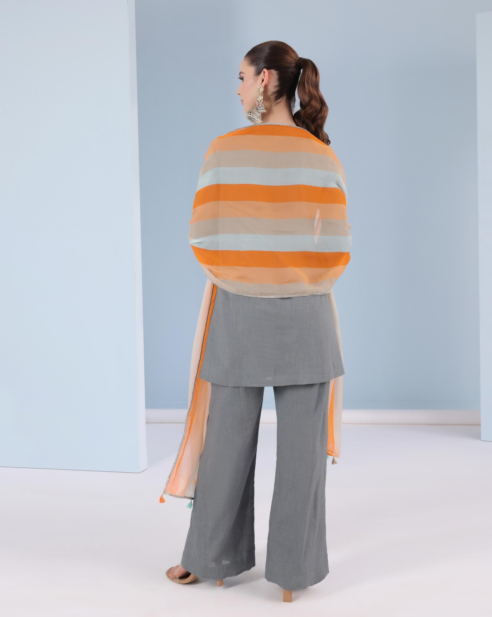 Paired with coordinated straight-leg trousers, the silhouette is streamlined and sophisticated, while the ombre striped dupatta in shades of saffron, ivory, and grey adds a striking pop of color, completing the ensemble with a modern touch.