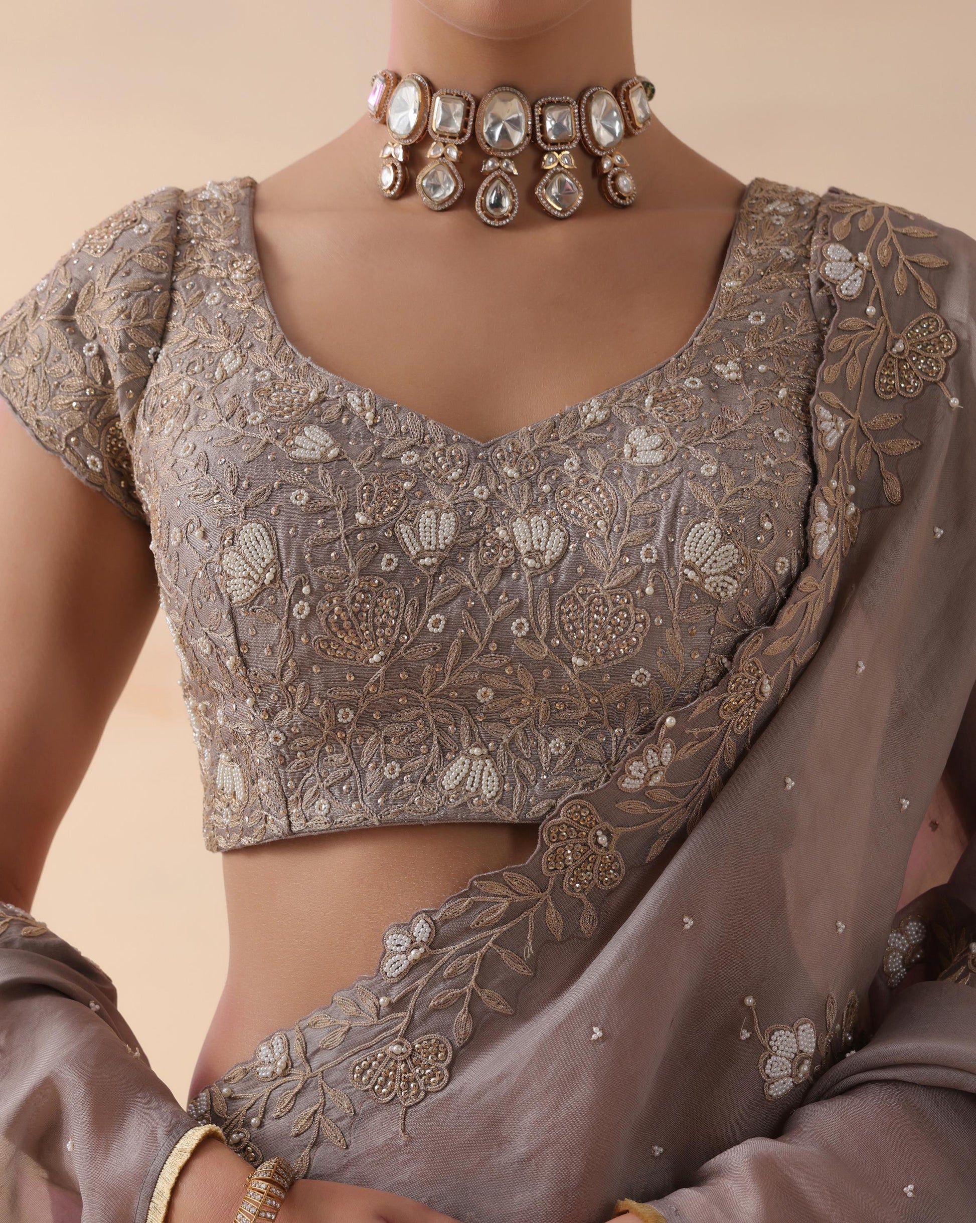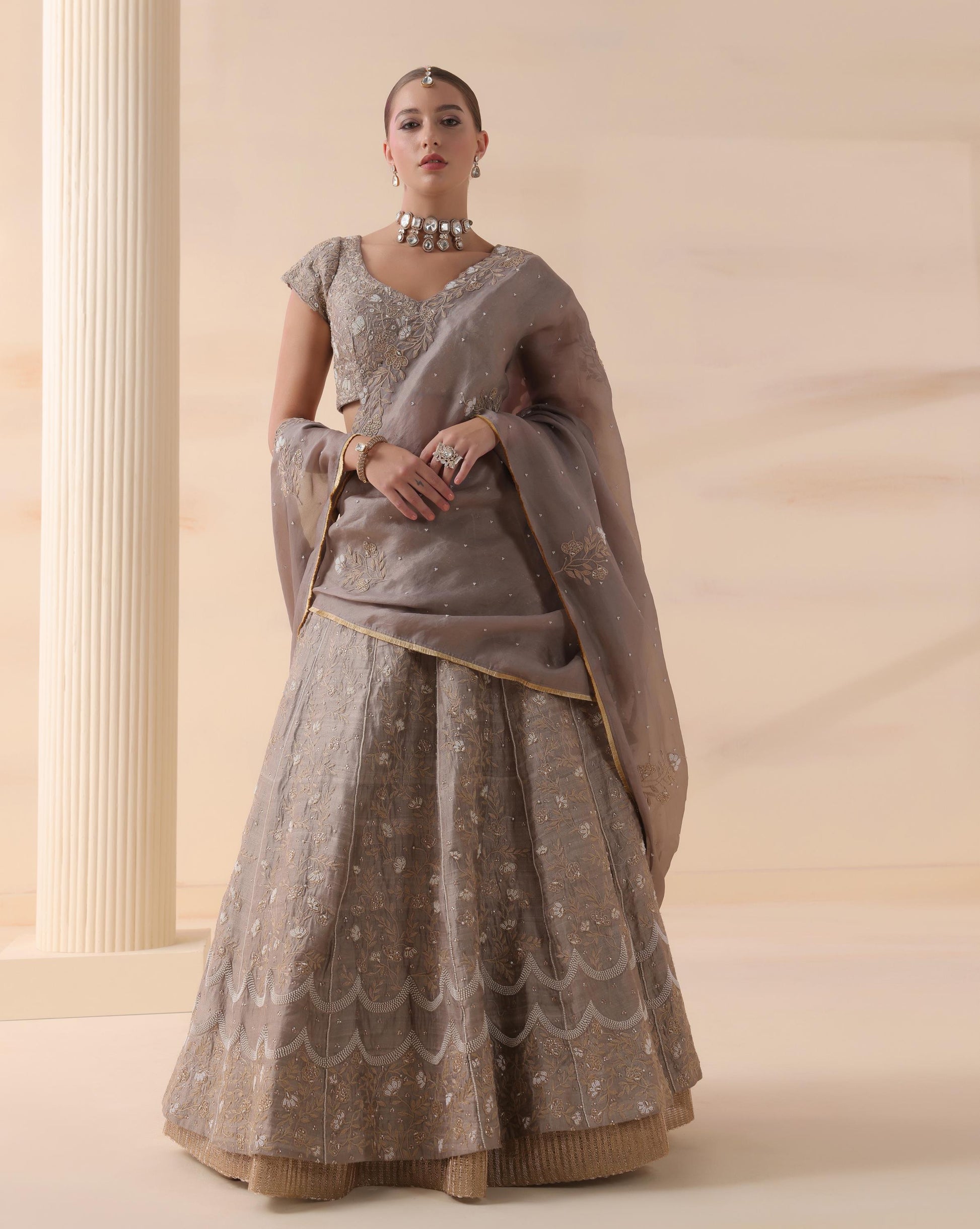 The Dusky Royale Lehenga Set is an opulent ensemble crafted in a muted taupe-grey tone, radiating understated grandeur. The blouse features a sweetheart neckline with short sleeves, richly adorned with intricate zari, resham, and sequin embroidery in delicate floral motifs. Paired with a voluminous lehenga, the skirt is layered with scalloped threadwork and detailed patterns, adding depth and movement to the look. The dupatta, sheer and ethereal, is embellished with fine floral vines and dainty buti embroidery, bordered with a subtle golden finish. Perfect for weddings and regal soirées, this lehenga strikes the ideal balance between tradition and contemporary elegance.