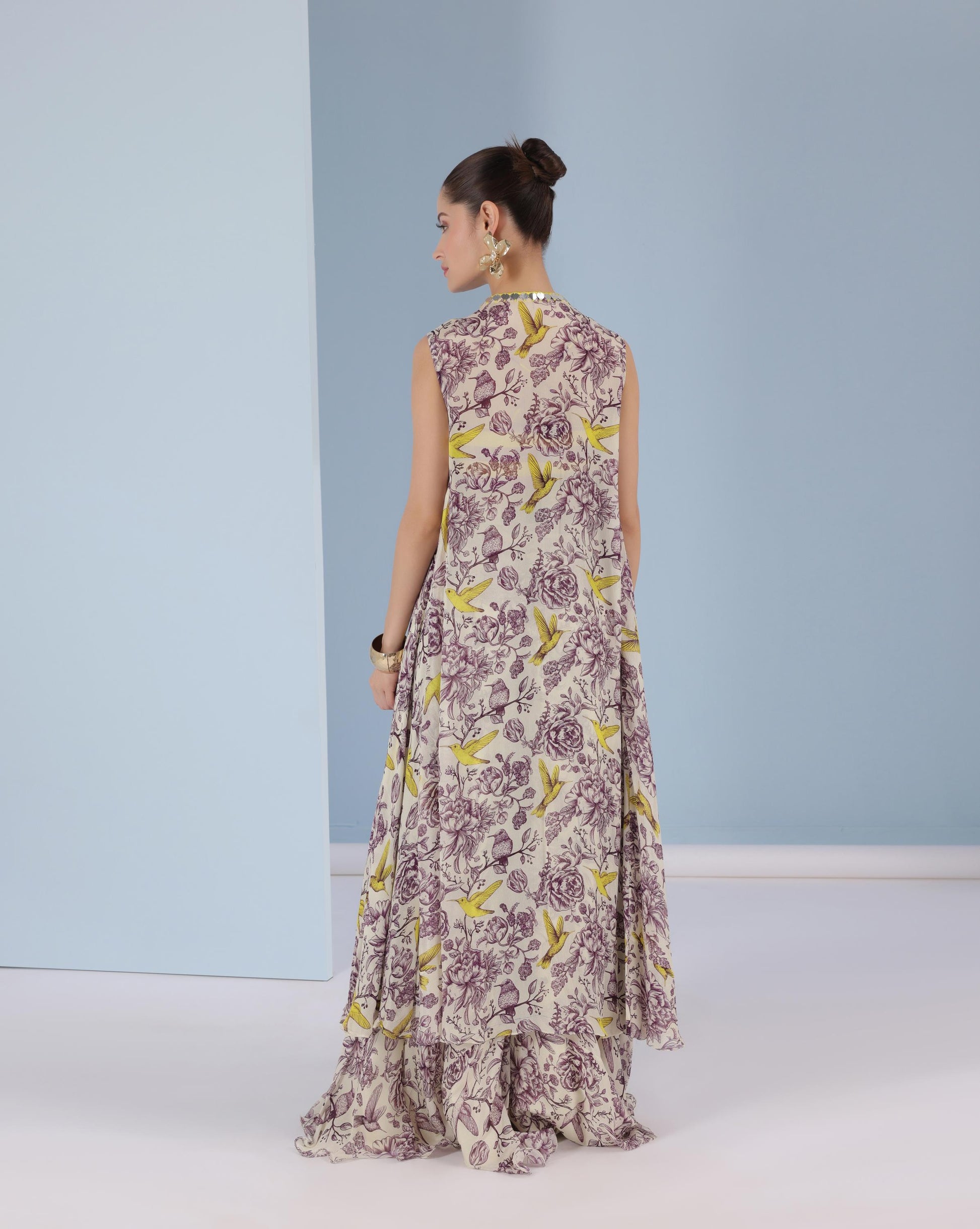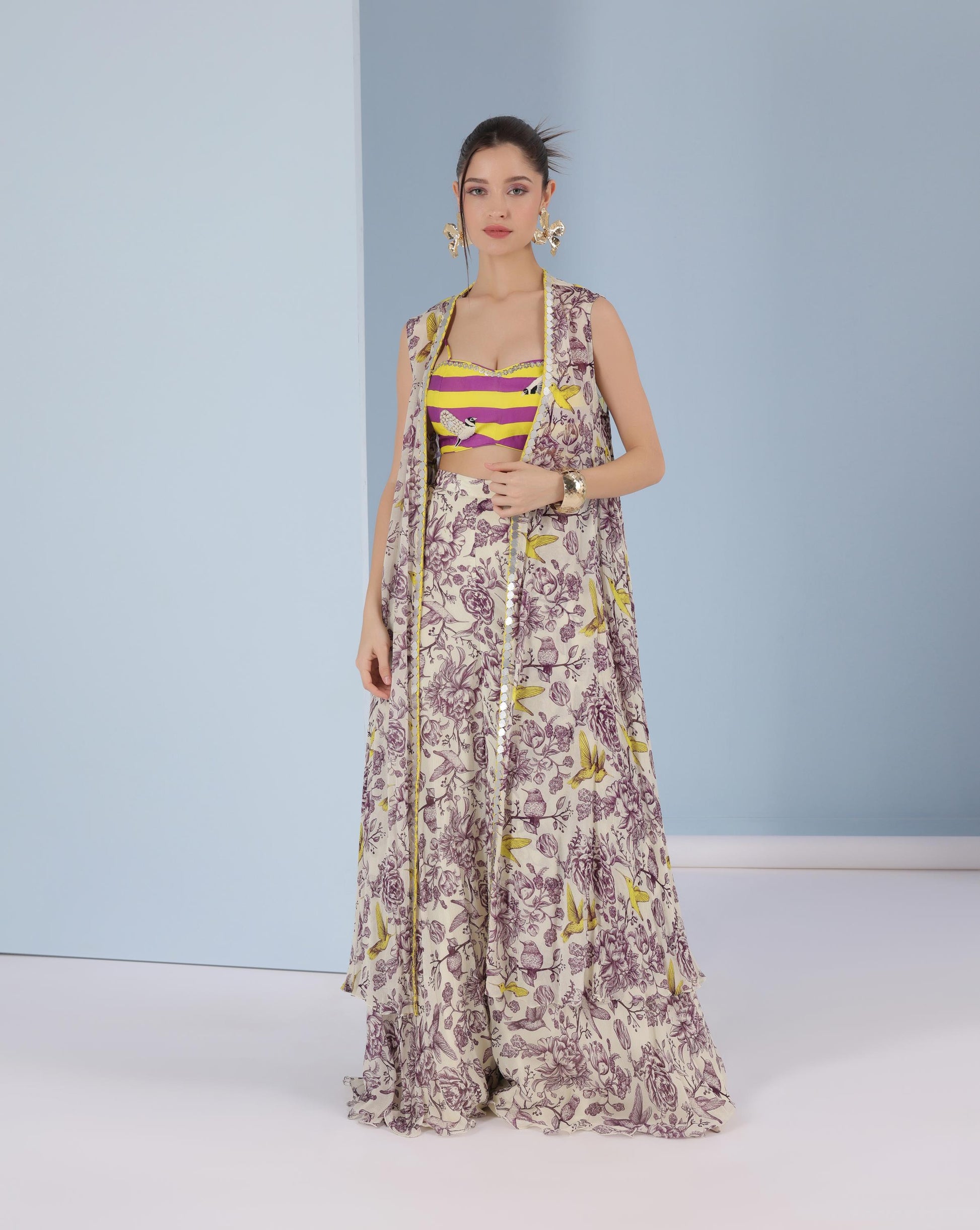 Layered with a flowy ivory cape and palazzo pants, both printed in a delicate botanical sketch pattern highlighted with pops of canary yellow birds, the silhouette exudes effortless movement and charm. Finished with mirror-work edging, the cape adds a subtle sparkle, making the outfit festive yet modern.