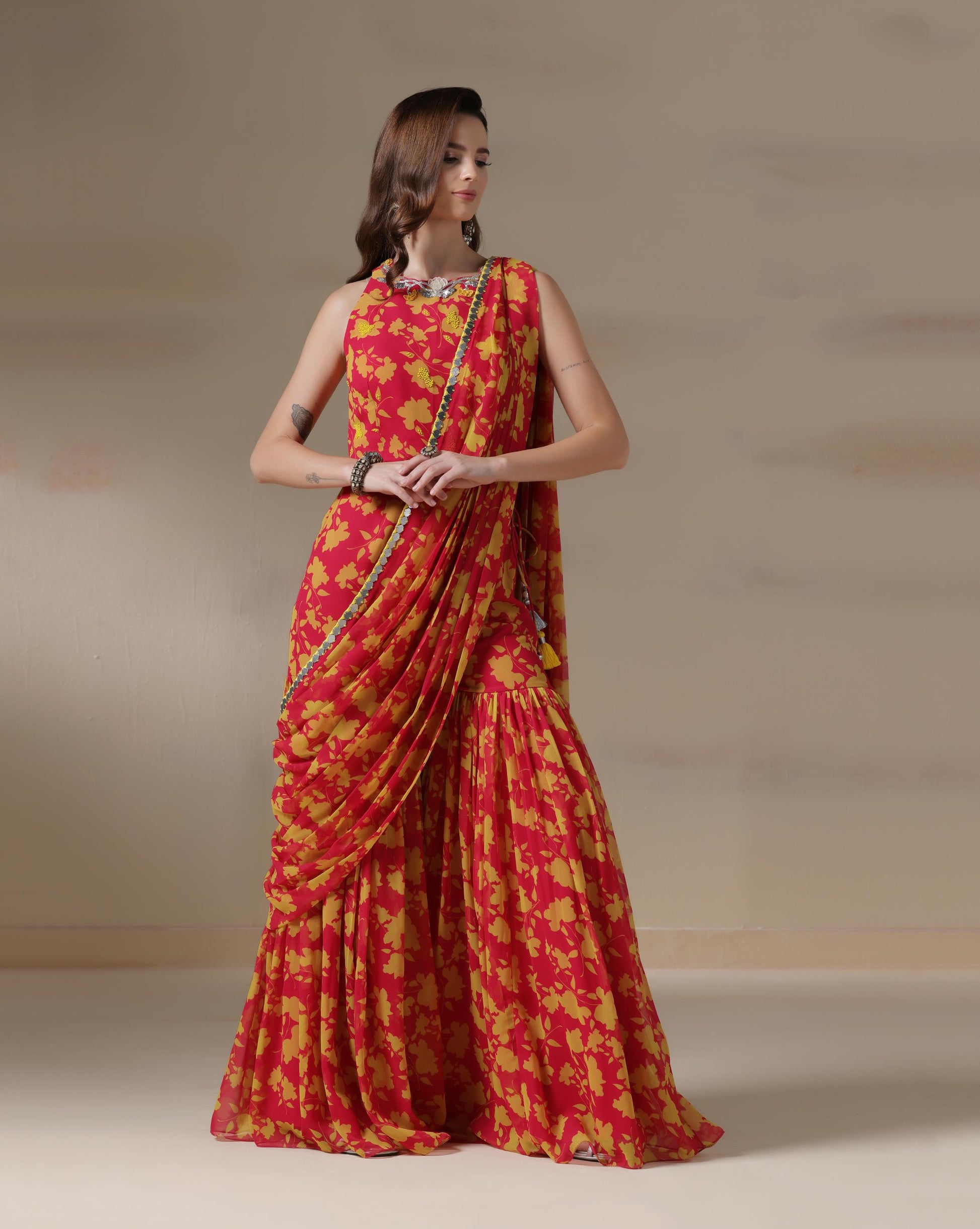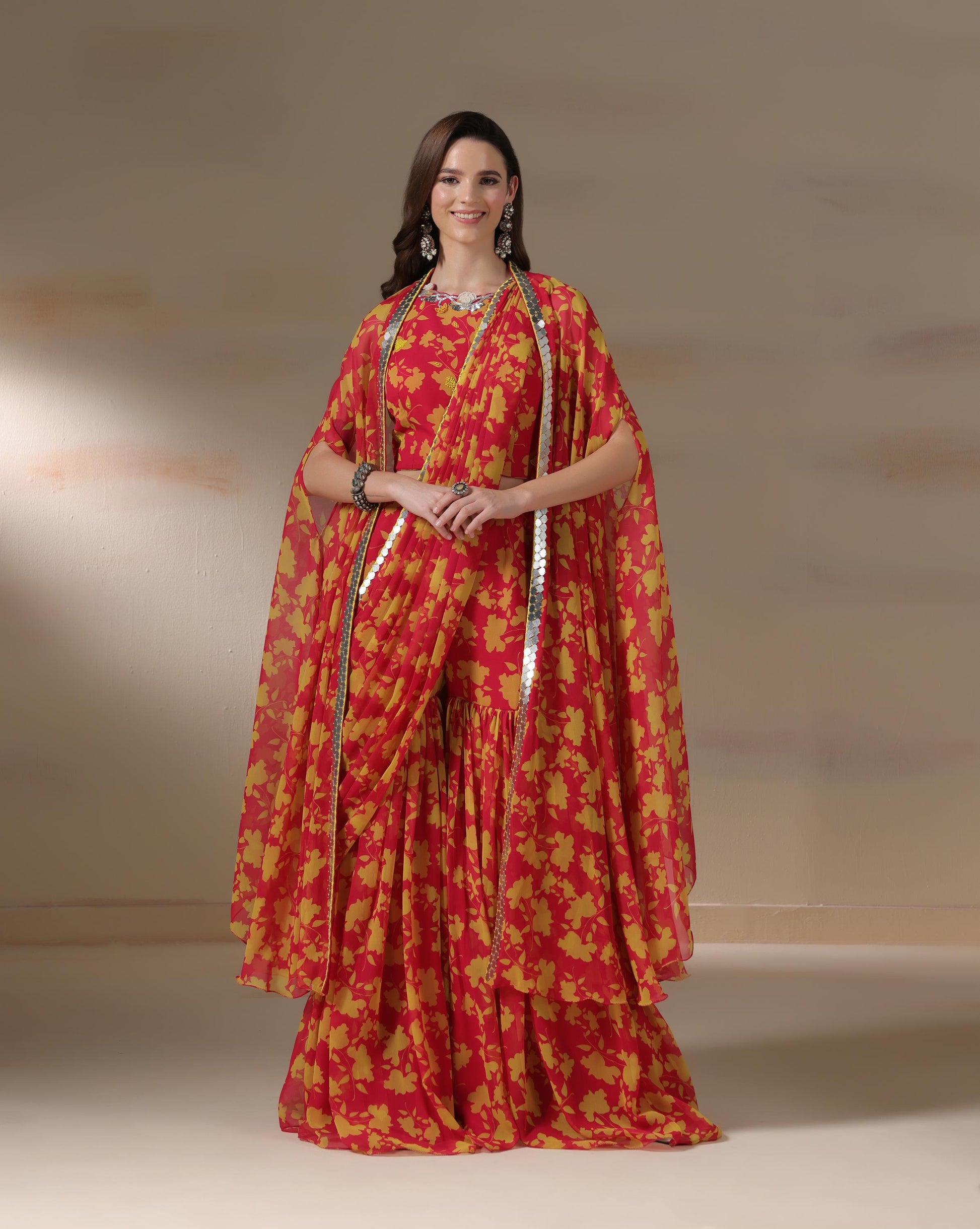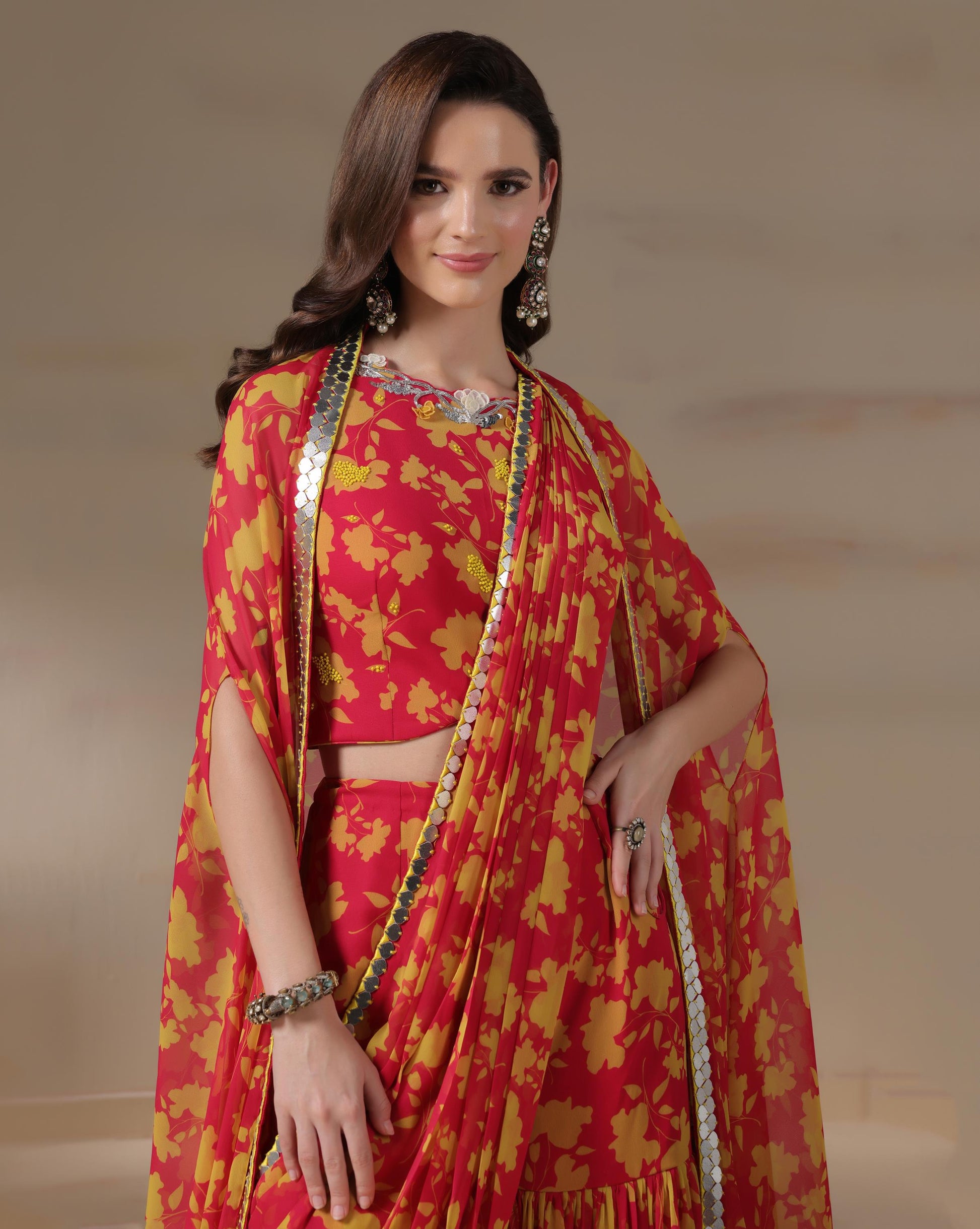 A radiant blend of traditional charm and contemporary silhouette, the Sunset Bloom Saree Gown is designed in a fiery red base adorned with bold mustard floral motifs. Draped like a saree yet styled as a gown, this ensemble offers ease without compromising elegance. The mirrored scallop border adds shimmer, while the fluid georgette fabric ensures graceful movement. Perfect for festive soirées and weddings, this vibrant piece celebrates the warmth of Indian traditions with a modern edge.