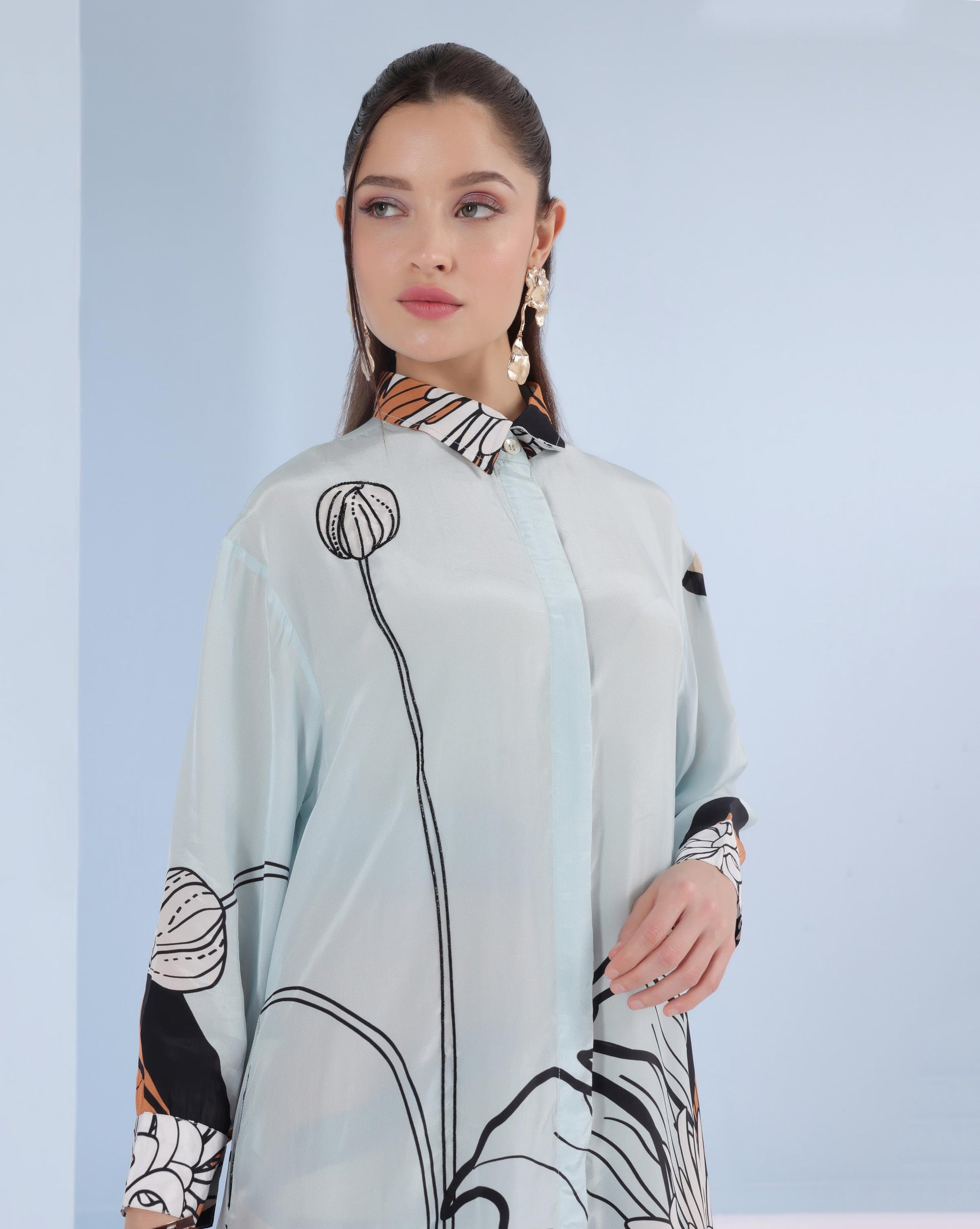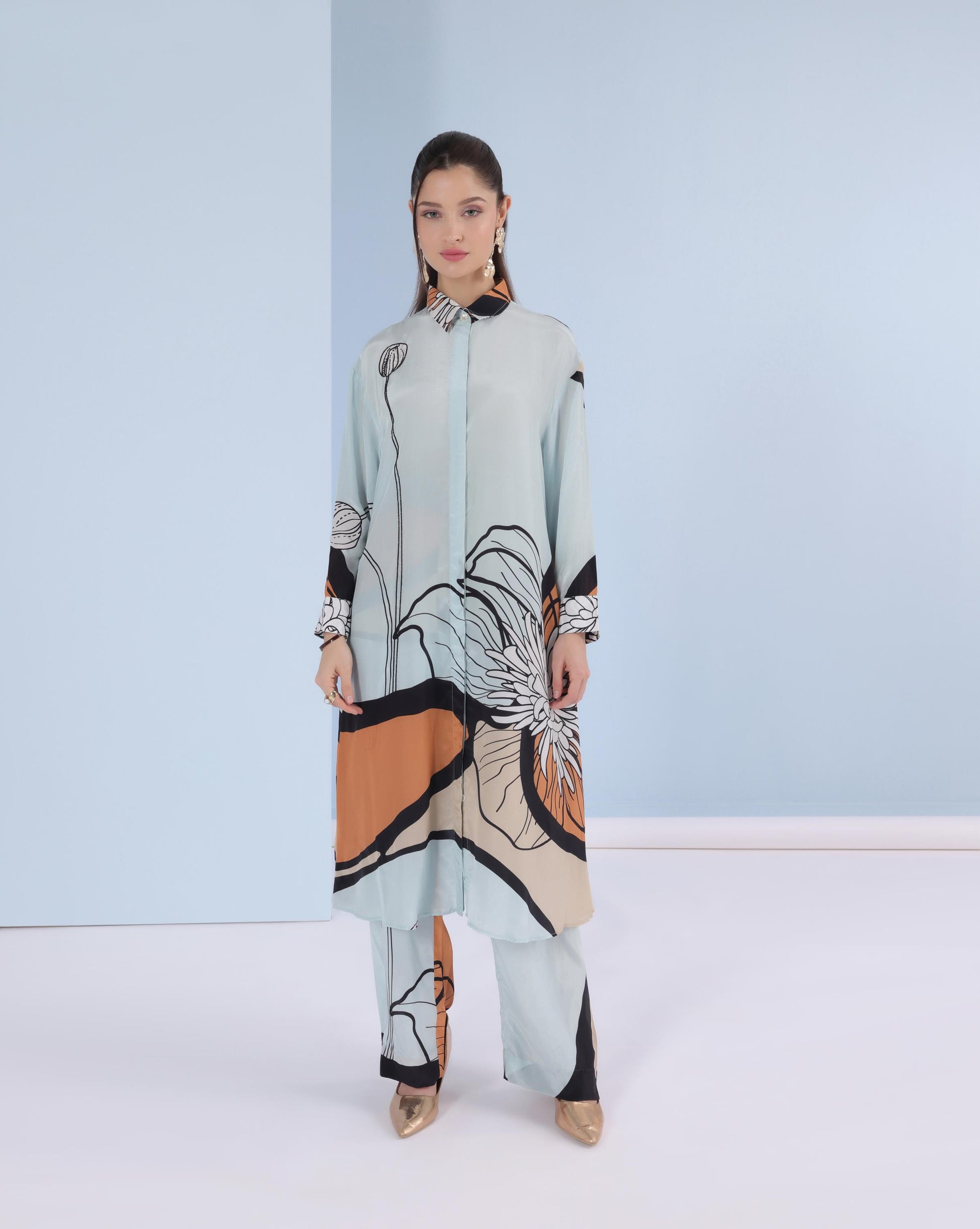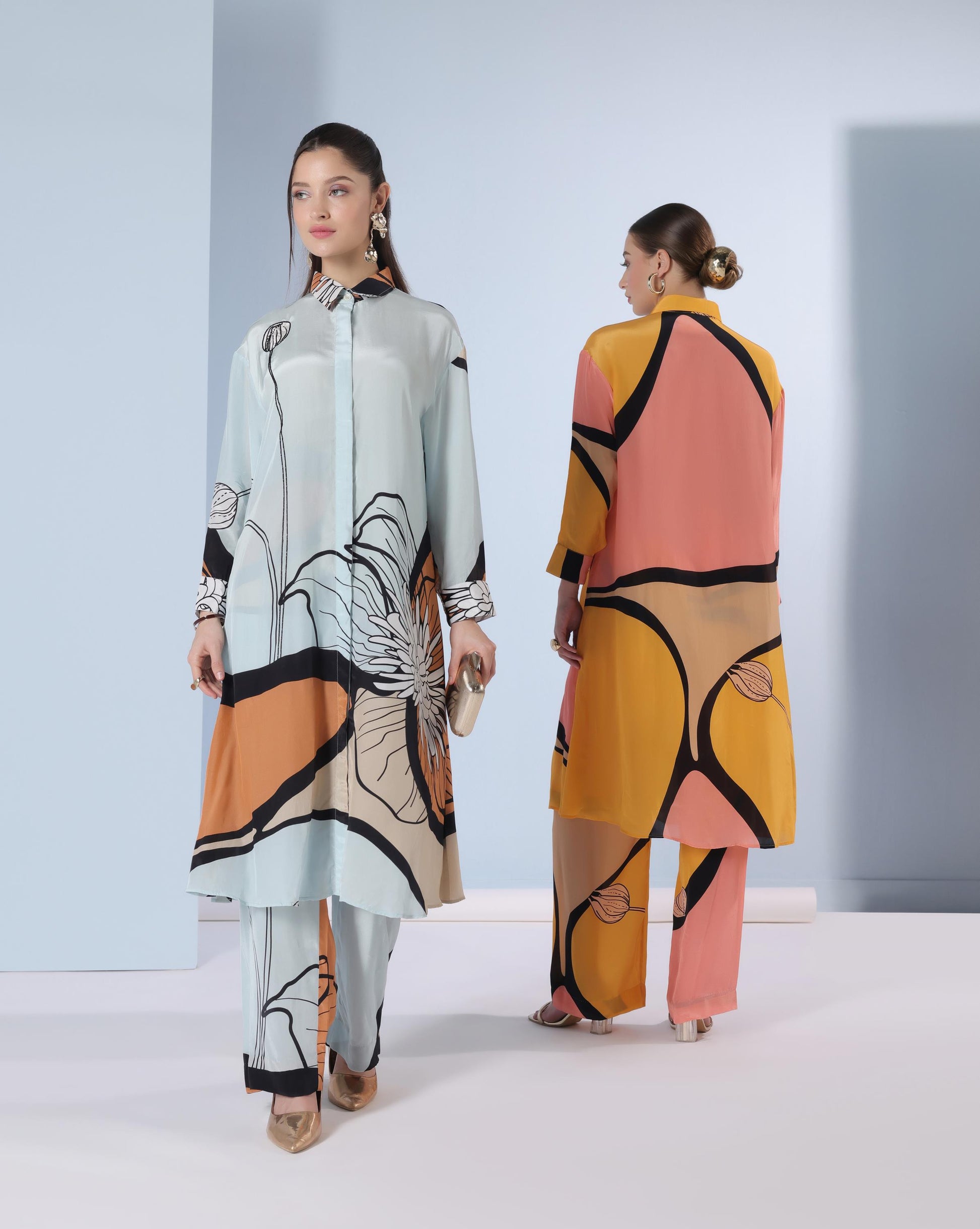 This ensemble beautifully balances serenity and vibrance with its soft aqua base adorned in bold oversized floral sketches. The long flowy kurta, styled with a shirt collar featuring contrasting earthy tones, creates a refreshing yet contemporary look. Paired with wide-leg trousers in matching abstract floral placement, this outfit is both artistic and modern. Lightweight and fluid, it makes an ideal choice for daytime occasions, summer soirées, or casual festive gatherings, where style meets effortless comfort.