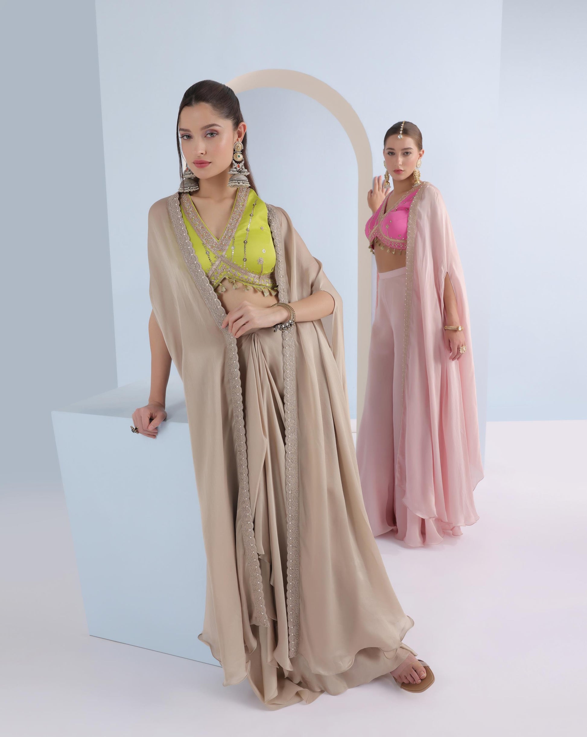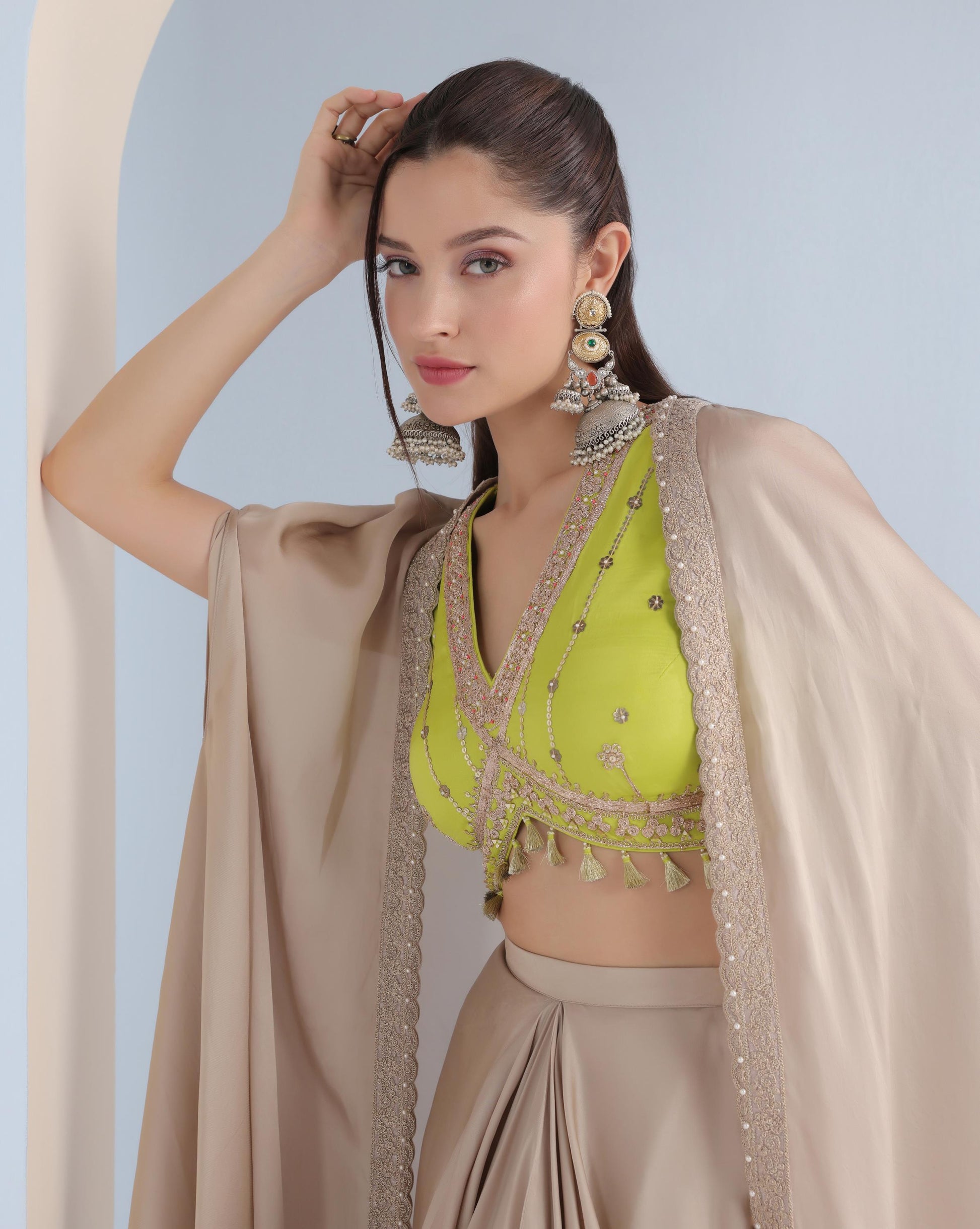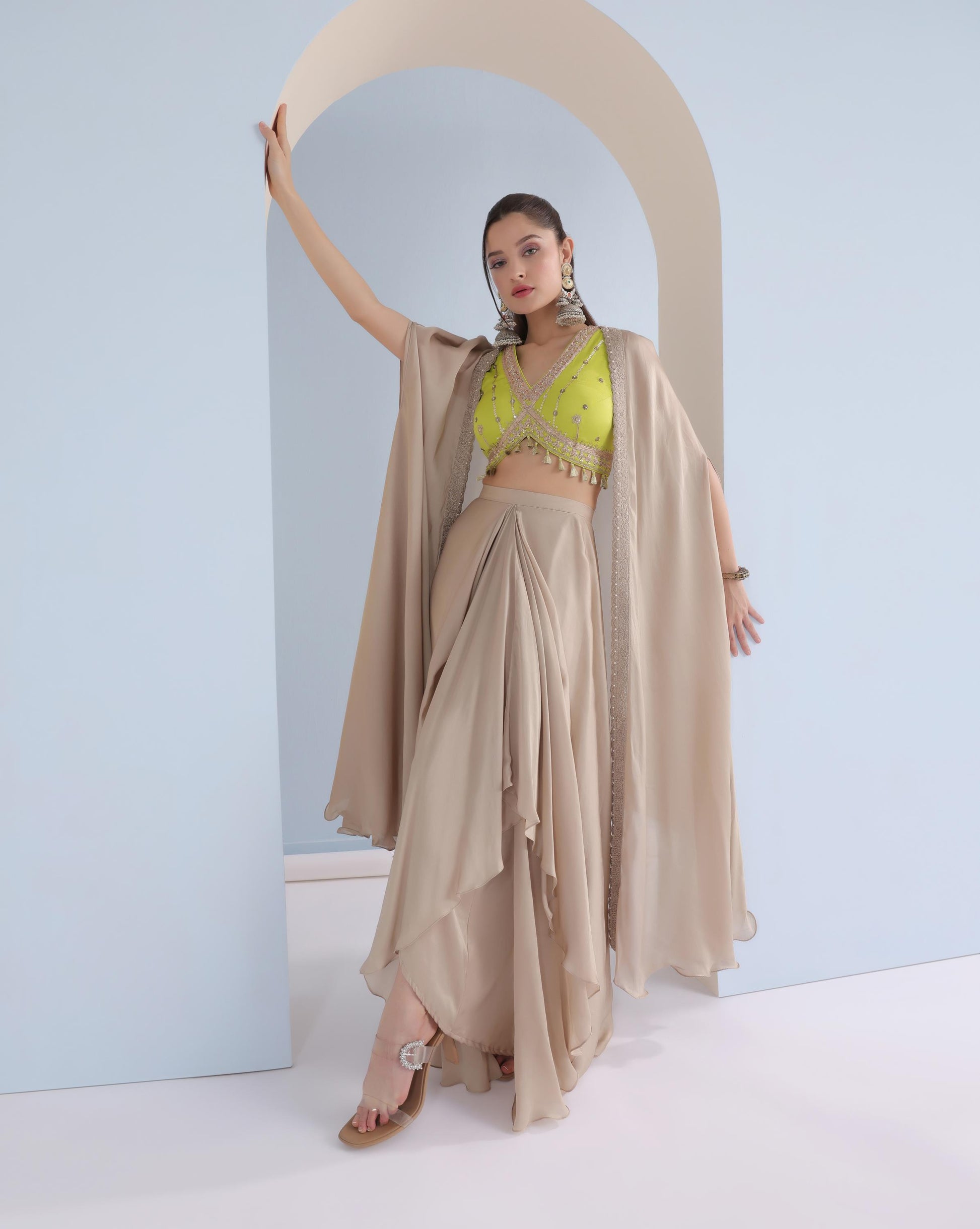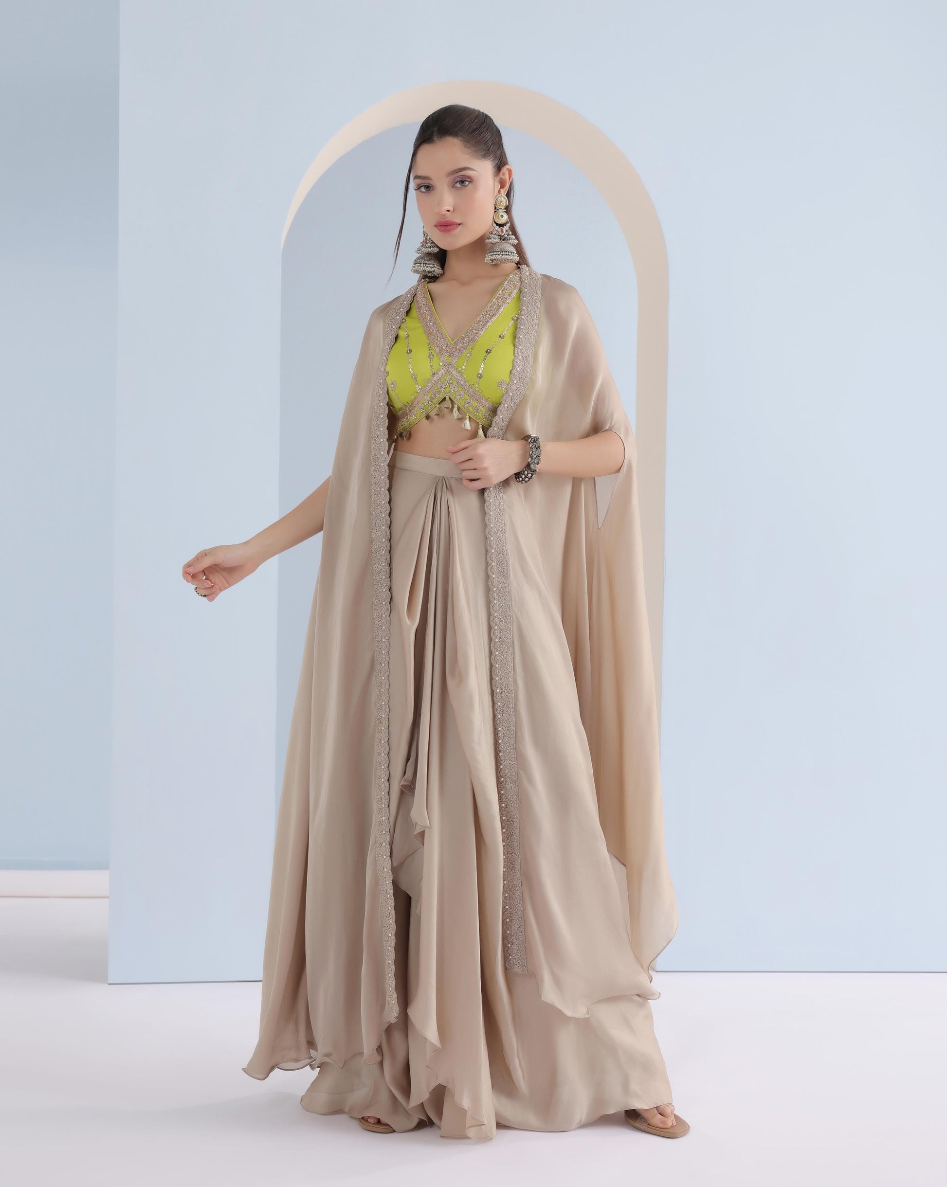 Perfect for festive soirées, mehendi functions, or contemporary wedding celebrations, this ensemble fuses tradition with a modern edge, making a bold yet graceful statement.