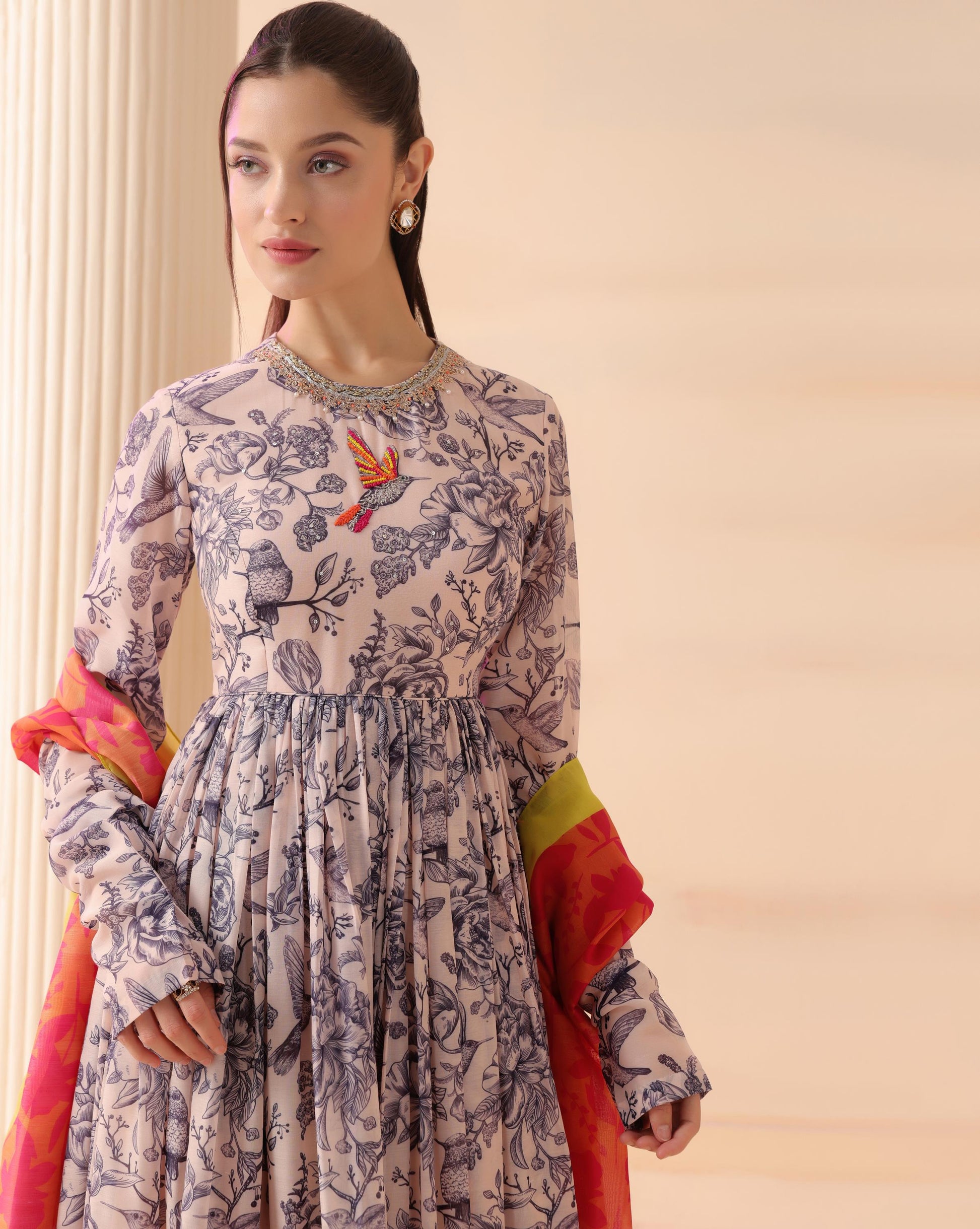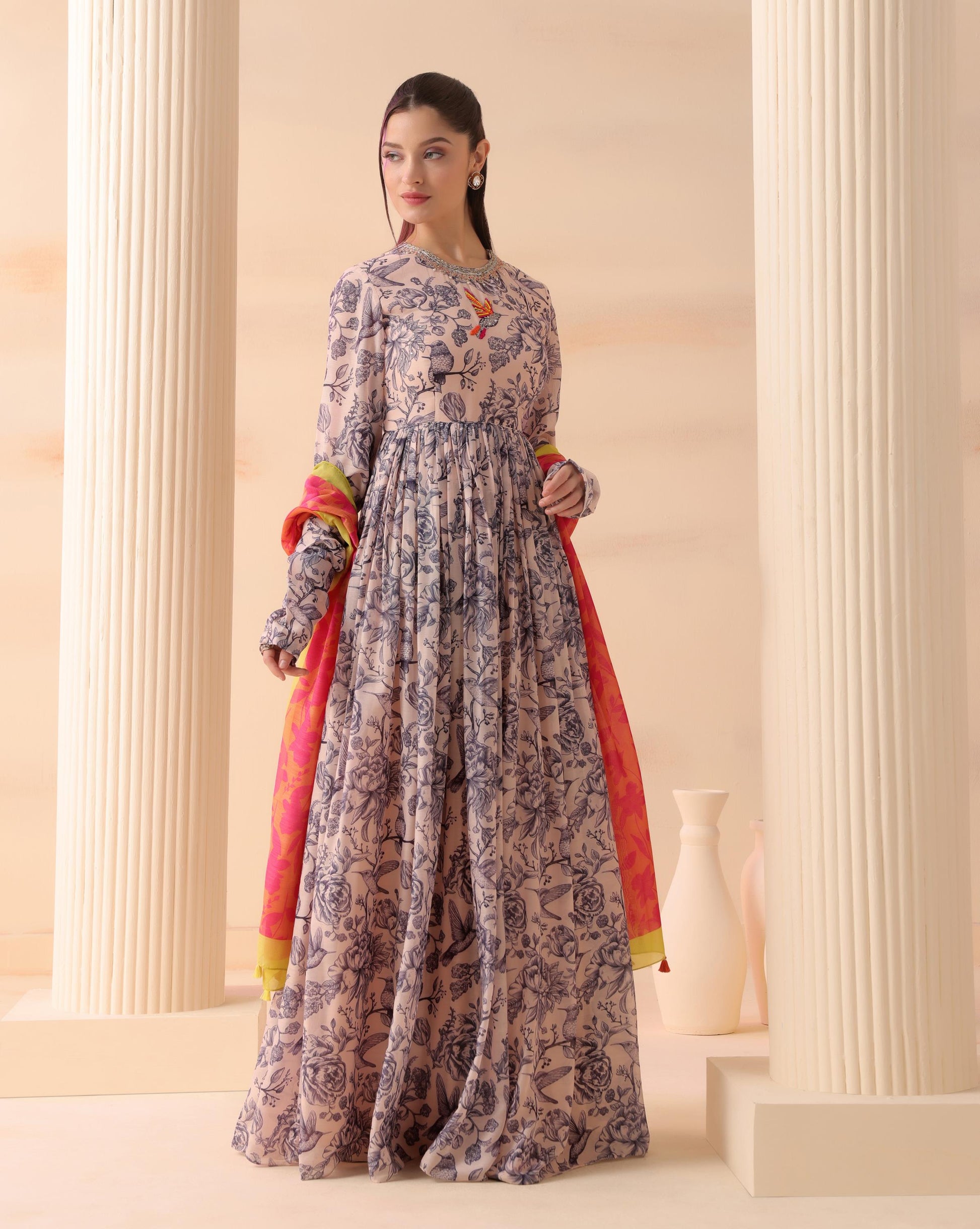 The Twilight Garden Anarkali is a dreamy ode to elegance, blending tradition with a touch of modern artistry. Crafted in a soft blush base, the gown features intricate monochrome floral and bird sketches that evoke the charm of a vintage botanical illustration. A delicate pop of color emerges with embroidered birds, bringing life and vibrancy to the subtle print. The silhouette cinches at the waist and flows gracefully into a full-length skirt, offering both comfort and grandeur. Paired with a vibrant dupatta in hues of red and lime green, this ensemble seamlessly balances muted sophistication with bold vibrancy. Perfect for festive gatherings, daytime weddings, or elegant soirées, it’s a piece that tells a story of nature and timeless femininity.